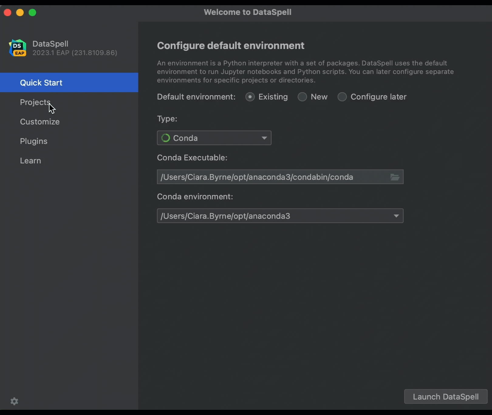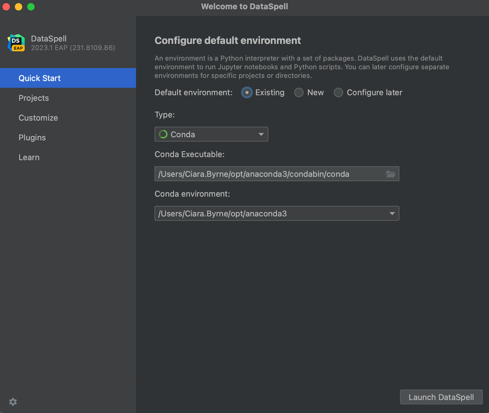 要在工作区中使用 DataSpell,请在欢迎屏幕的左窗格中选择 Quick Start(快速启动)选项,配置一个默认环境,然后点击 Launch DataSpell(启动 DataSpell)。
