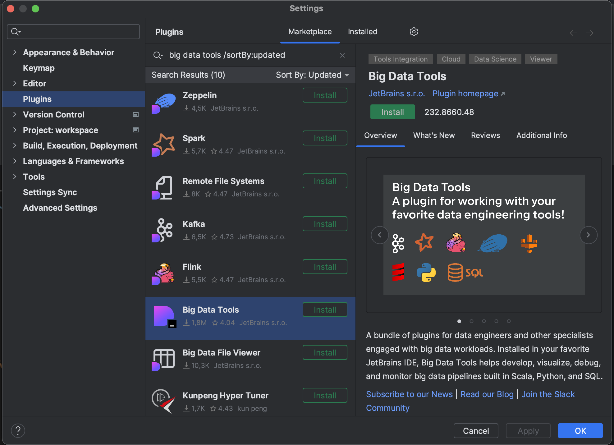 我们分解了 Big Data Tools 插件,允许单独使用其各个部分。 这让 DataSpell 得到六个新插件:Kafka、Spark、Flink、Remote File Systems、Big Data File Viewer 和 Zeppelin。 如果您需要全部六个插件,仍然可以一键安装 Big Data Tools 插件。