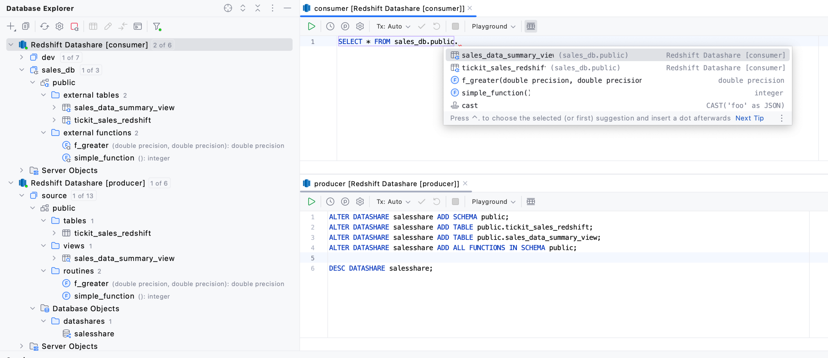 现在,共享数据库及其内容均会内省。 创建这些数据库的数据共享也会内省。 您可以使用 Ctrl/Cmd + F6 快捷键修改共享数据库和数据共享。 另外,所有相关语句在 SQL 编辑器中均受支持。