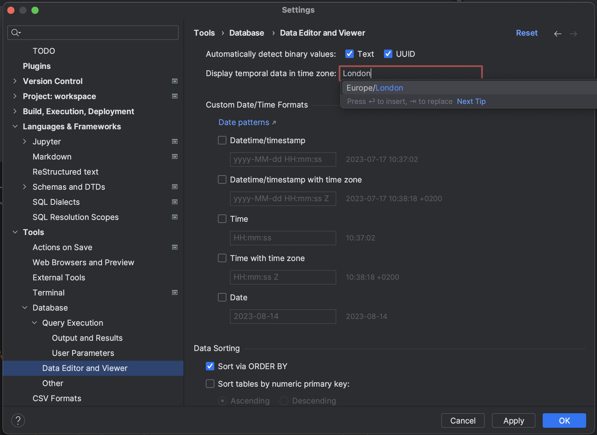 DataSpell 提供了新的 Time zone(时区)设置,供您指定应用于显示 datetime 值的时区。