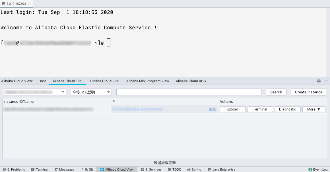 配置访问密钥(AccessKey,包括 AccessKey ID 和 AccessKey Secret)后,您可以在 Cloud View 工具窗口中获取或搜索不同区域中的 ECS 和 RDS 实例。 而且,您可以使用 SSH 通过内置的终端查看实例属性、运行诊断、连接到实例、上传文件,只需点击一下即可轻松完成全部操作。