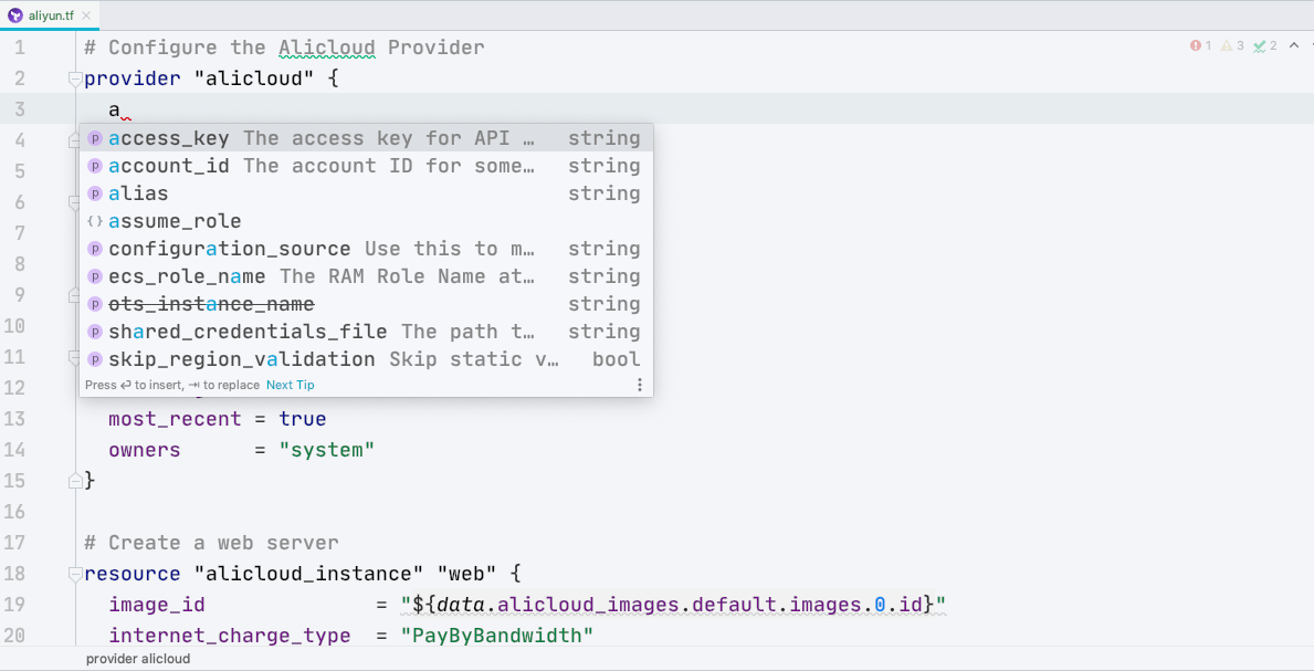 您现在可以使用代码配置基础架构,因此,为什么不使用世界一流的 IDE 来编码基础架构呢? 使用 HashiCorp Configuration Language (HCL) 插件,您可以利用 JetBrains IDE 功能(如 Ctrl + 点击)转到基础架构代码中的定义。 Terraform provider 支持阿里云,您可以使用它轻松地构建自己的基础架构。