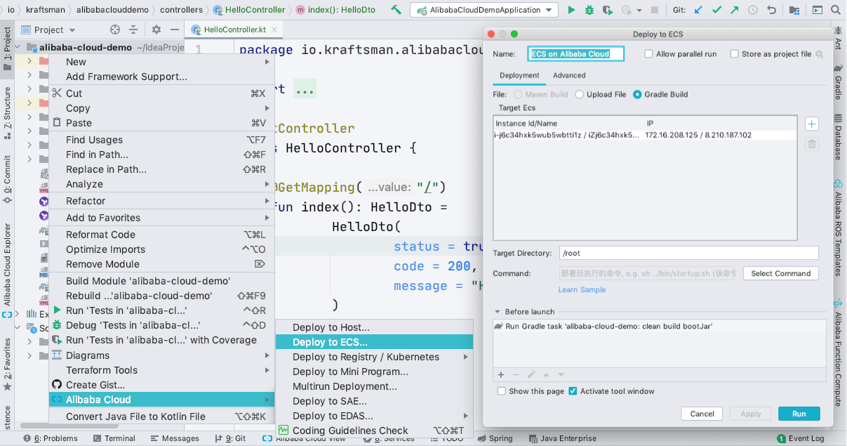 Alibaba Cloud Toolkit 与所有基于 JetBrains IntelliJ 平台的 IDE 紧密集成。 无论您使用哪种编程语言,都可以通过 Run Configuration 对话框部署您的应用程序。 支持在部署前使用 Maven 或 Gradle 构建您的应用程序, 也支持在任务完成时运行部署后命令。 如果您想要使用无服务器解决方案,可以在您的 JetBrains IDE 中开发函数计算项目并将代码上传到阿里云。
