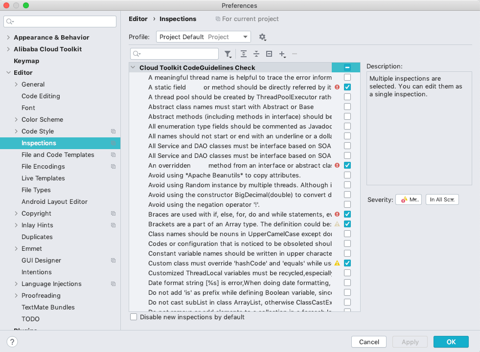 JetBrains IDE 提供内置的语言解析器和审查工具,可以帮助您正确地编写代码。 使用 Alibaba Cloud Toolkit 可以自动按照 阿里巴巴 Java 开发手册检测代码中的潜在问题。
