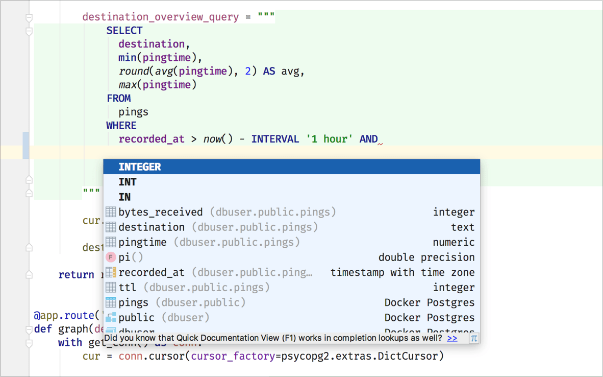 边开发边查看您的数据:通过在 JetBrains IDE 中集成 DataGrip,您不仅可以查看数据,还可以完成行业领先、能够真正了解数据的 SQL 补全。 每当您在代码中编写查询时,集成数据库的所有 JetBrains IDE 都会为您提供可以感知架构的 SQL 补全。