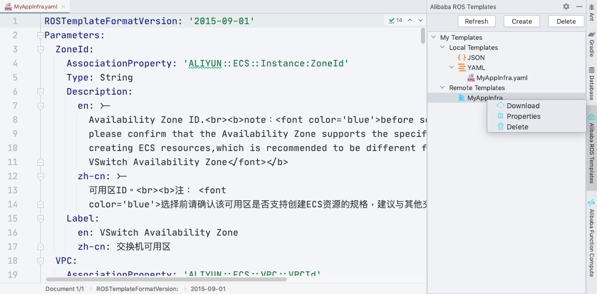 阿里云资源编排服务(ROS)是阿里云提供的基础架构即代码(IaC)解决方案。 您可以在 JetBrains IDE 中使用 JSON 或 YAML 格式编辑 ROS 模板。 您可以通过 Alibaba Cloud ROS Templates 工具窗口下载或上传模板, 然后在阿里云平台上执行。