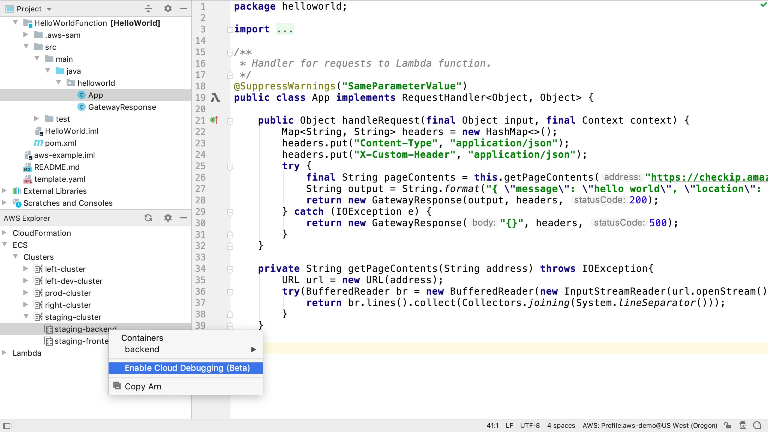 AWS Toolkit 现在支持云调试。 只需选择 ECS 服务的暂存副本,点击“Enable Cloud Debugging”,然后定义一个可将调试器附加到代码的运行配置。 现在可用于 Java、C# 和 Python。 当然,您所做的任何代码更改都可以直接从 IDE 上传到您的 ECS 服务。