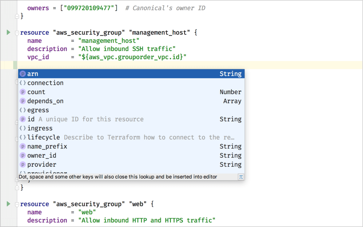 除了对语法的基本支持外,这些插件还提供更深入的集成。 代码补全可以如您预期一般运行,各种检查则有助于确保您的基础架构配置有效。