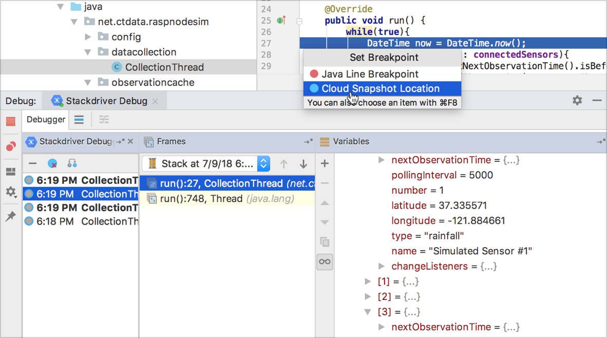 借助 Google 的 Cloud Tools for IntelliJ 插件,您可以更进一步。 附加到 Google Stackdriver 调试器后,您可以从在 Google App Engine 或 Google Compute Engine 中运行的 Java 或 Kotlin 应用程序中获取完整的堆栈跟踪(带局部变量值)。 只需在 IDE 中放置一个断点,即可从实时应用程序中获取快照。 当然,断点实际上并不会停止(或减缓)应用程序。