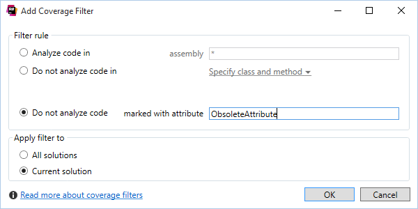 有时,您不希望了解整个解决方案范围内的覆盖率数据。 例如,您也许对标记 ObsoleteAttribute 的代码或特定遗留项目的覆盖率统计不感兴趣。