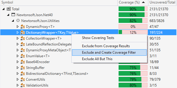 作为提前设置的或应用到打开的任何解决方案的筛选器的替代方法,您可以在使用某些项目时从覆盖率结果中将其排除。