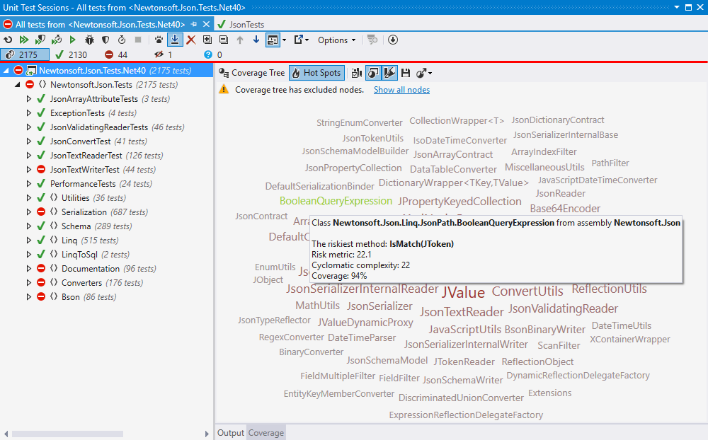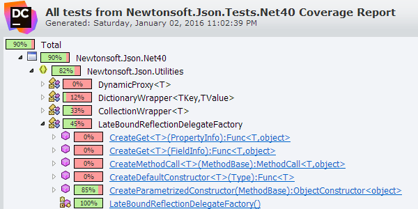 除了单元测试运行结果外,dotCover 还会显示一个覆盖树,其中包含单元测试对特定项目、命名空间、类型或类型成员的覆盖程度。
