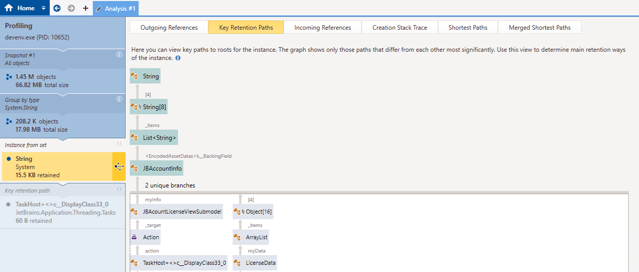 虽然内存分析一直以来都只是专业人士的地盘,但 dotMemory 独特的用户界面大大降低了这项工作的门槛,使内存分析变得简单明了。 您只需从上到下,从一组对象向下移动到特定实例,直到找出内存问题的真正原因。