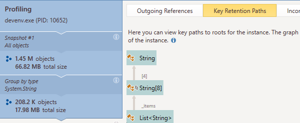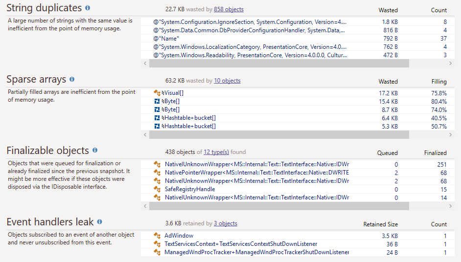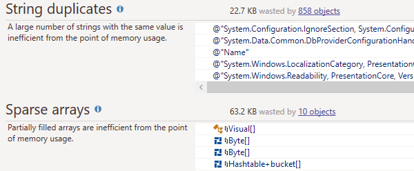 dotMemory 可以自动扫描快照,查找有无常见类型的内存问题,例如,字符串重复、稀疏数组、泄漏事件处理程序或 WPF 绑定。 如果您不知道从哪里开始,这些检查可以成为分析快照的良好起点。