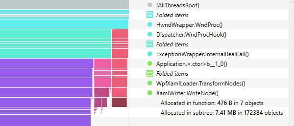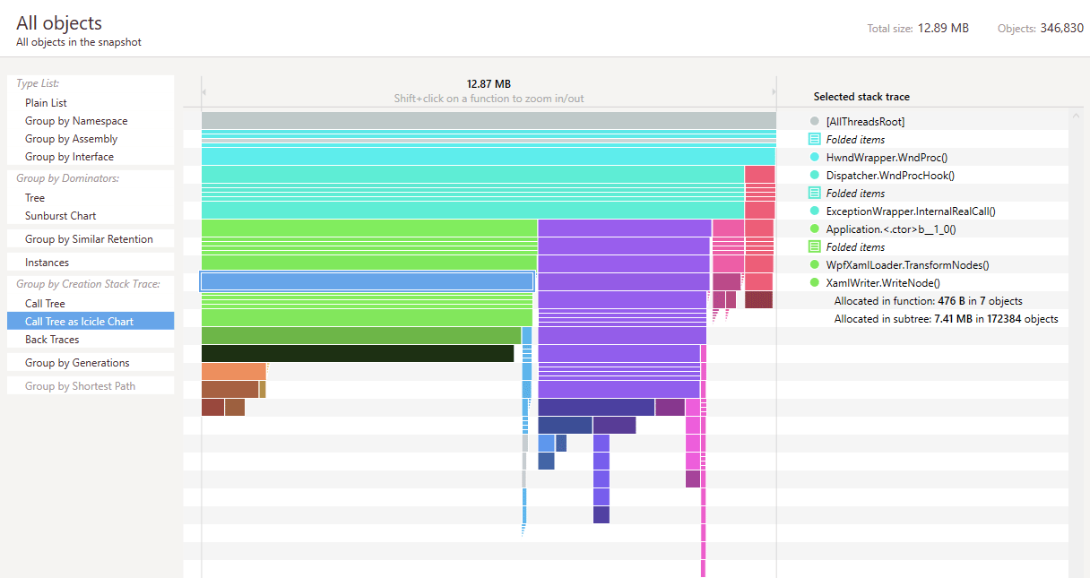 过多分配和垃圾回收可能意味着显著的内存管理开销。 使用流量视图可以了解在应用程序中最频繁创建/收集的对象,以及导致此内存流量的函数。