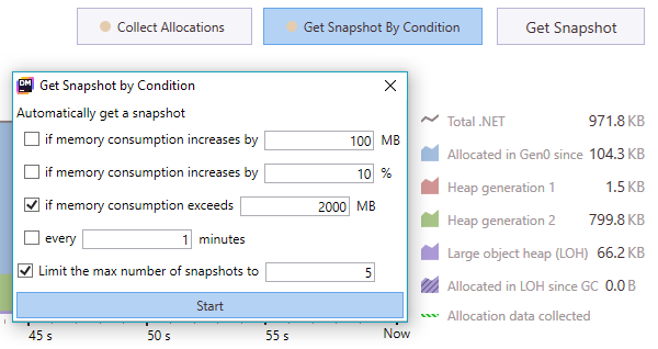 有时,您可能只有当某个条件成立时才有兴趣抓取快照。 因此,dotMemory 可以自动完成抓取快照的过程。 当应用程序的内存消耗大幅增加,或手动抓取快照变得棘手时,这尤其有用。 只需设置特定条件,并在满足条件后自动收集快照。