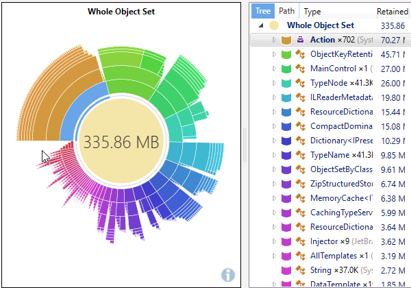 只需快速查看图表,就可以找出哪些对象对您的应用程序至关重要,并评估最大的结构:支配项保留的内存越多,中心角越大。