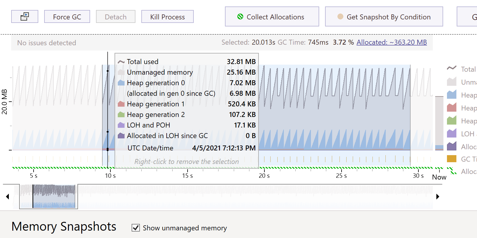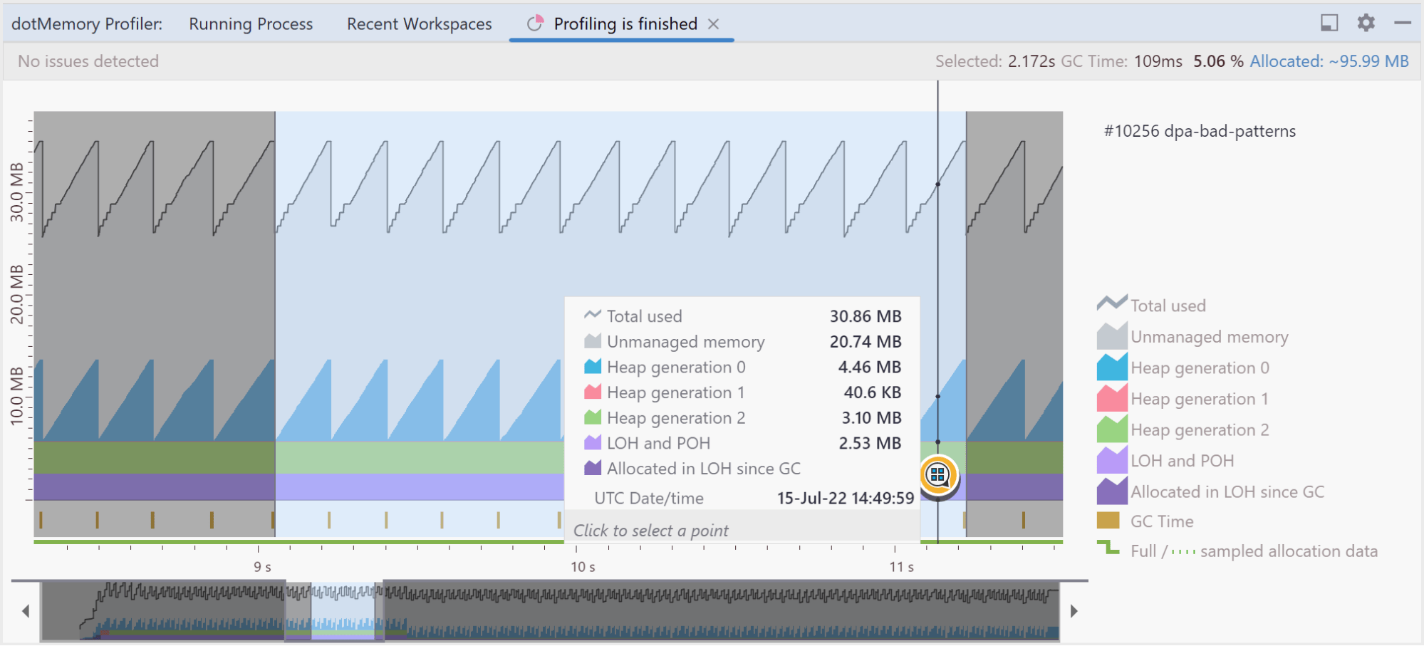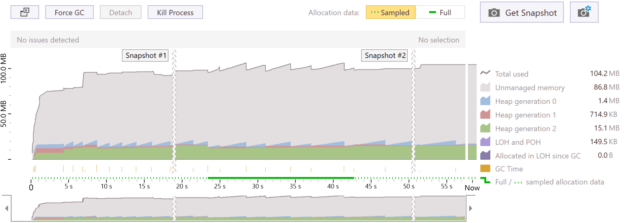 dotMemory 现在可以根据 ETW 事件获取有关内存分配的采样数据。 与收集分配数据的传统(统计)方式相比,采样的准确性较低,但具有许多优点: