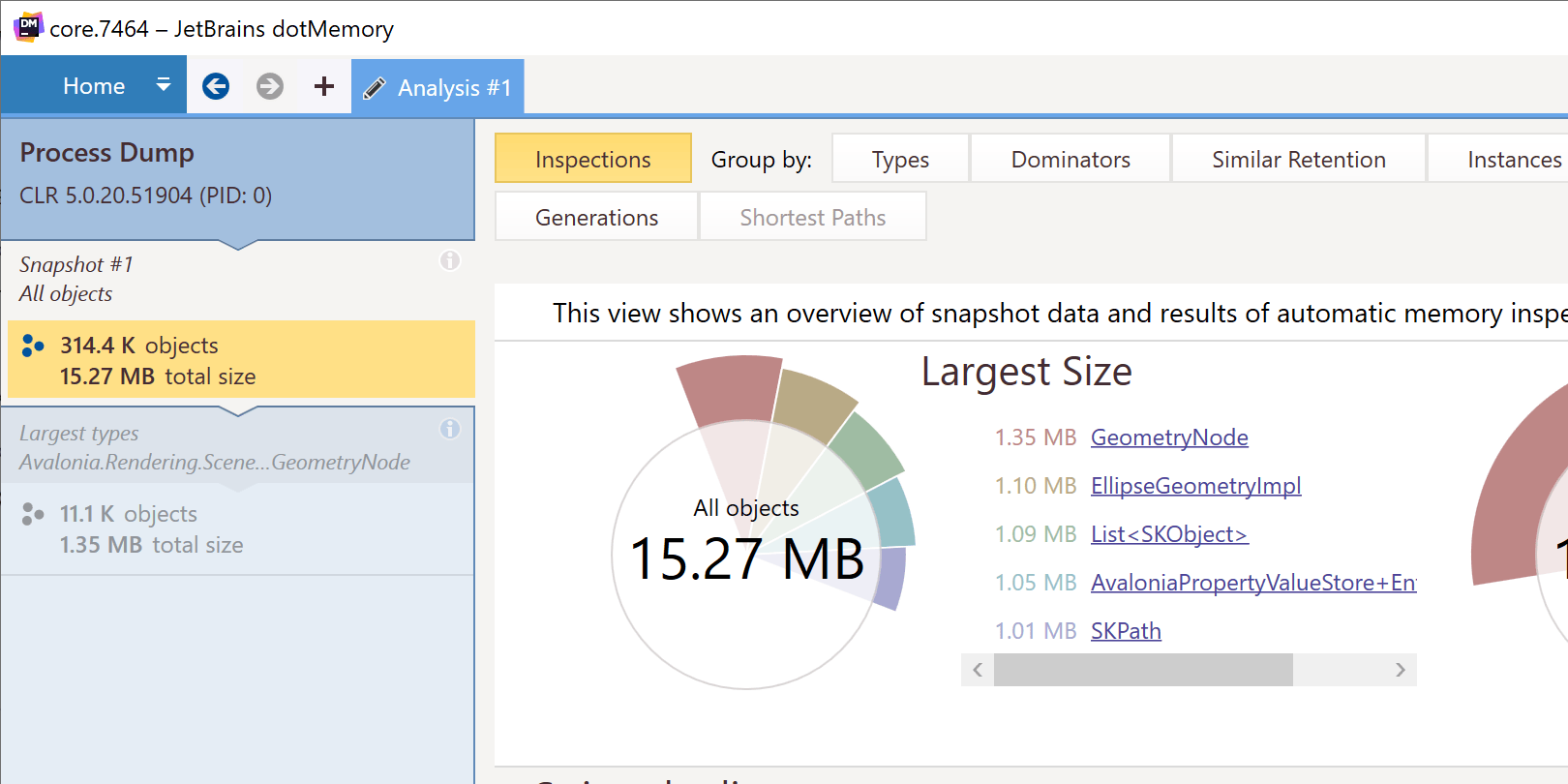 我们完全重新设计了支配树(对象保留图)背后的算法。 即使对象集包含数亿个对象,dotMemory 也只需几分钟即可打开特定视图。
