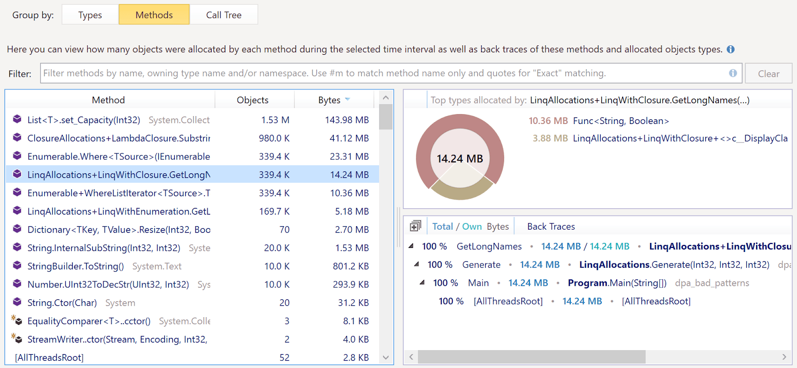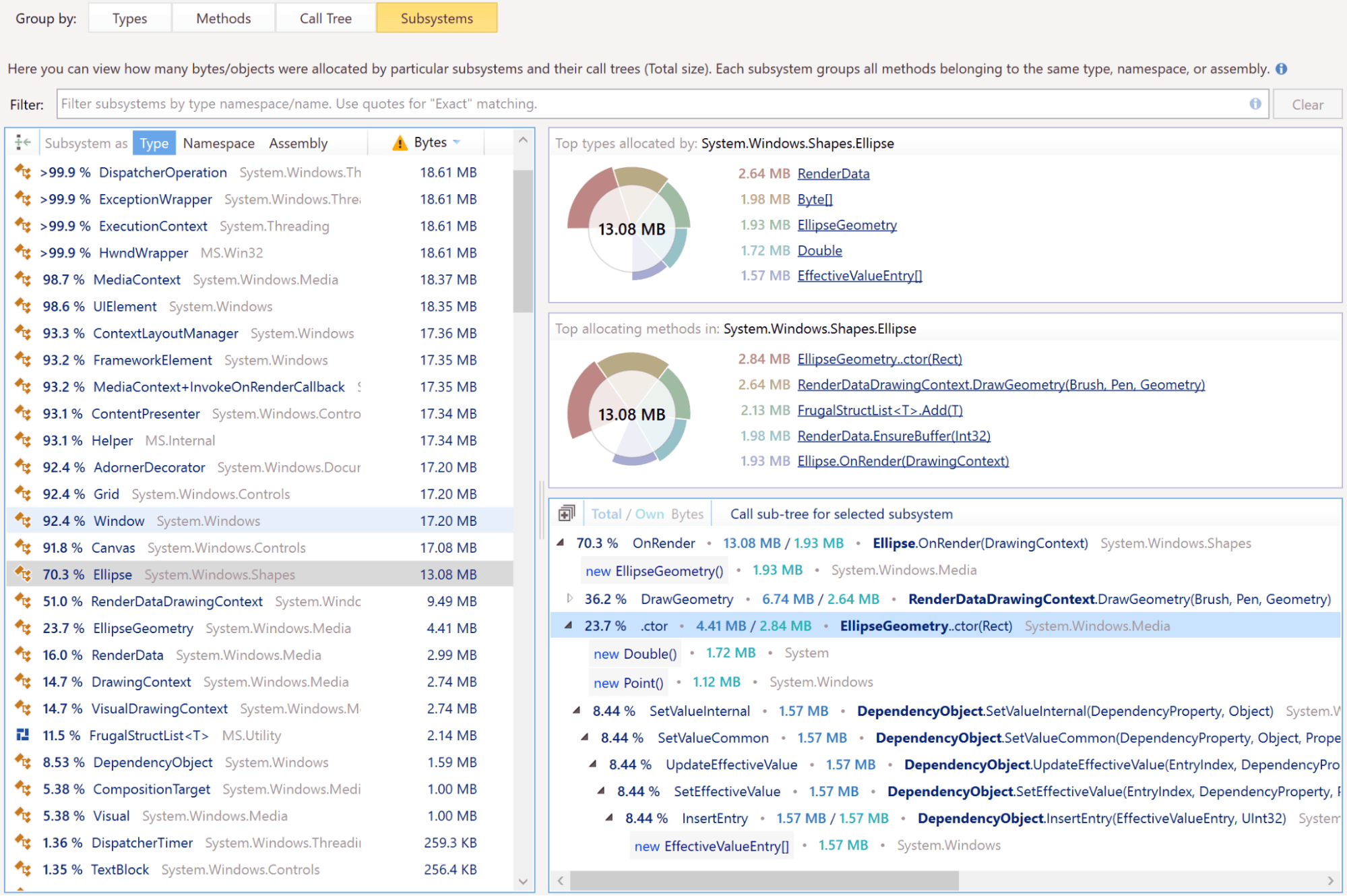 您现在可以使用 Subsystems(子系统)视图分析内存分配数据。 子系统将所有方法按所属类型、命名空间或程序集分组。 结果视图显示了子系统创建的对象以及每个子系统的合并调用树。