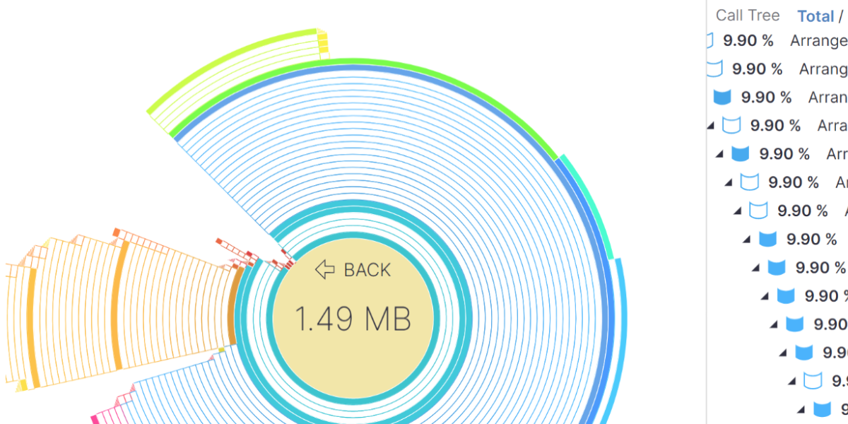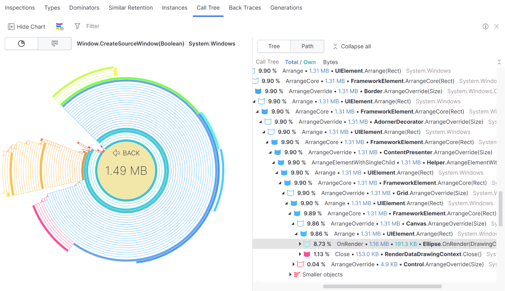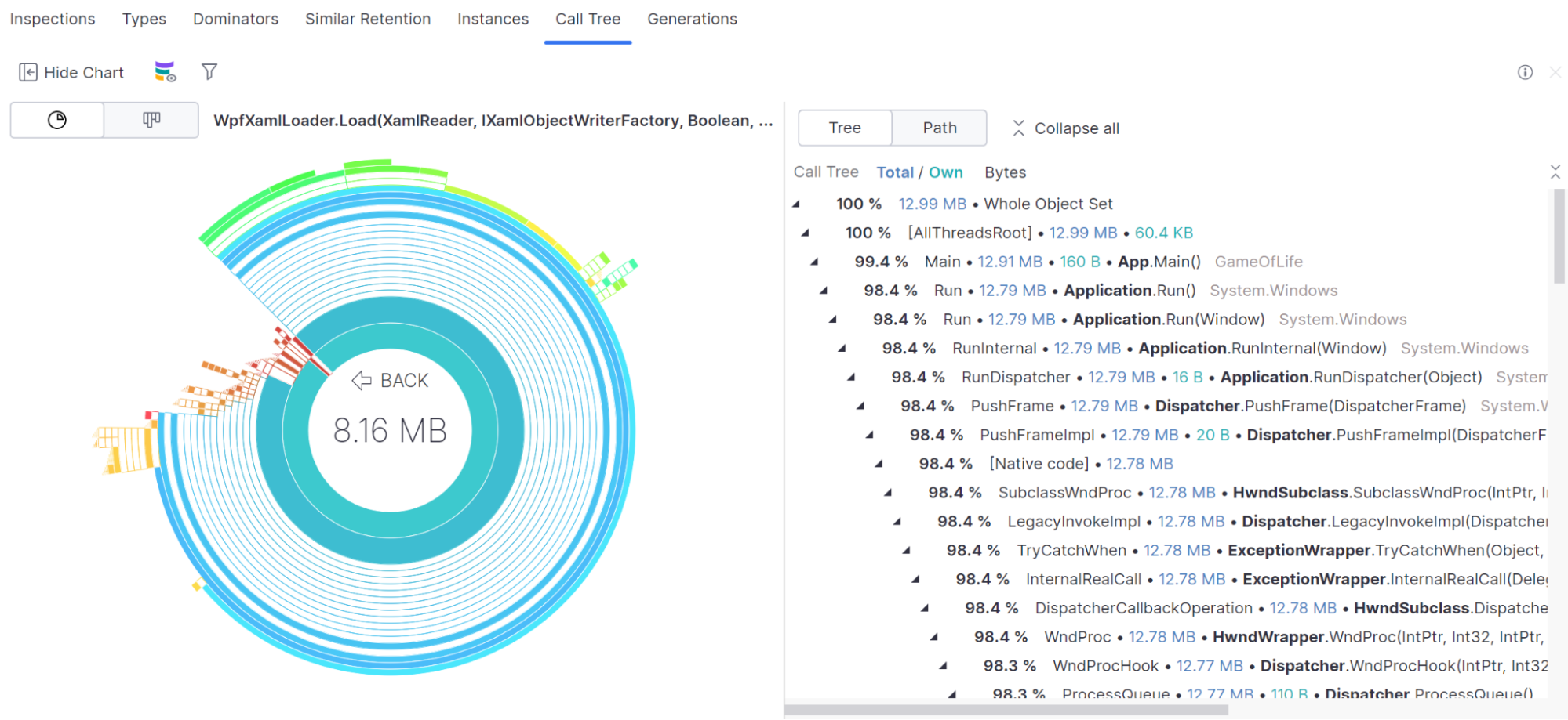现在,Call Tree(调用树)可以显示为 Sunburst(旭日)图,高亮显示分配最多内存的函数。 这项功能在独立版 dotMemory(Linux 和 macOS)和 JetBrains Rider 中的 dotMemory(Windows、Linux 和 macOS)中可用。