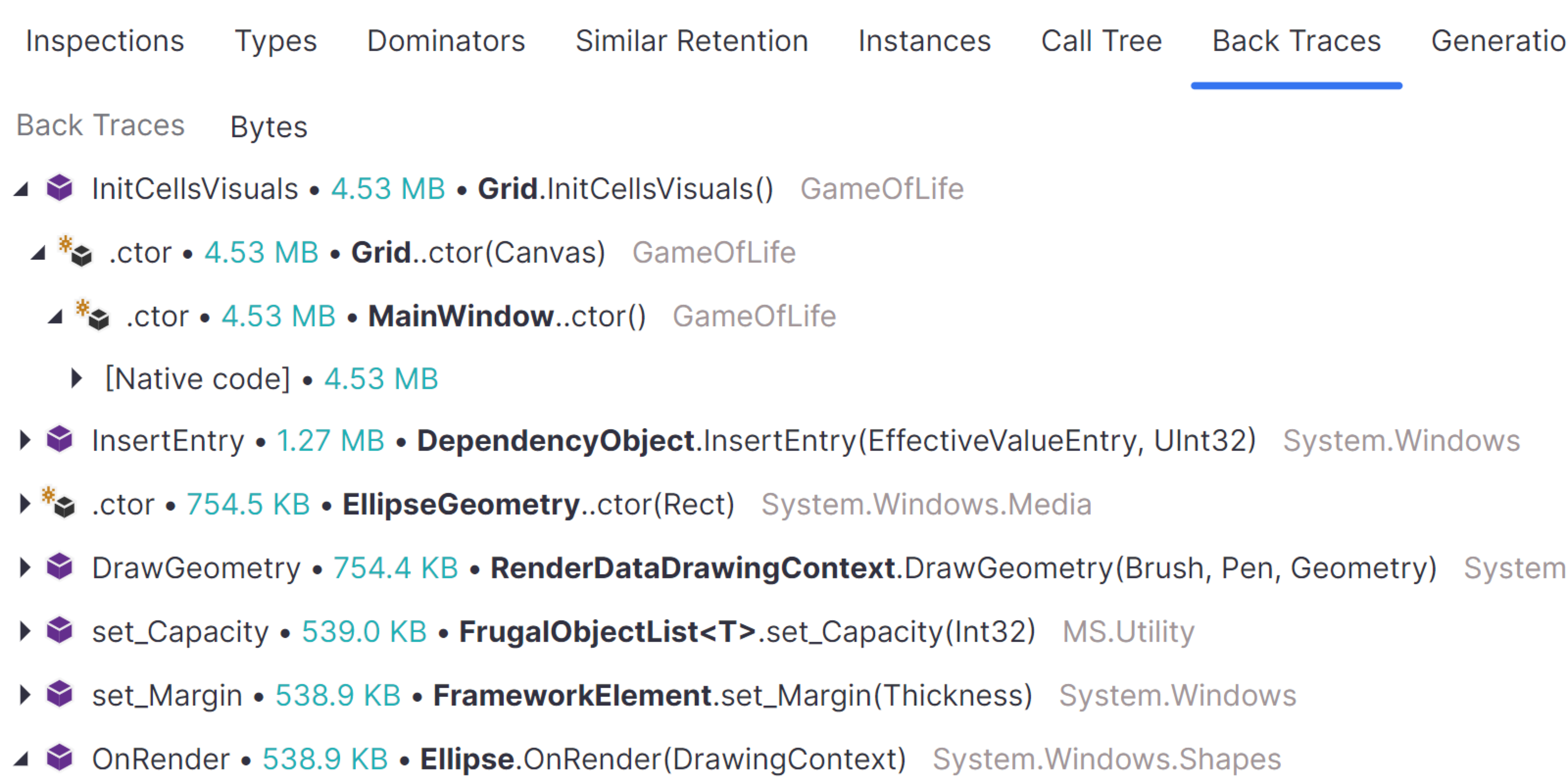 我们还重新实现了对象集的 Back Traces(反向跟踪)视图。 视图中的倒置调用树显示了从创建特定对象集的函数开始,从下到上的调用链。