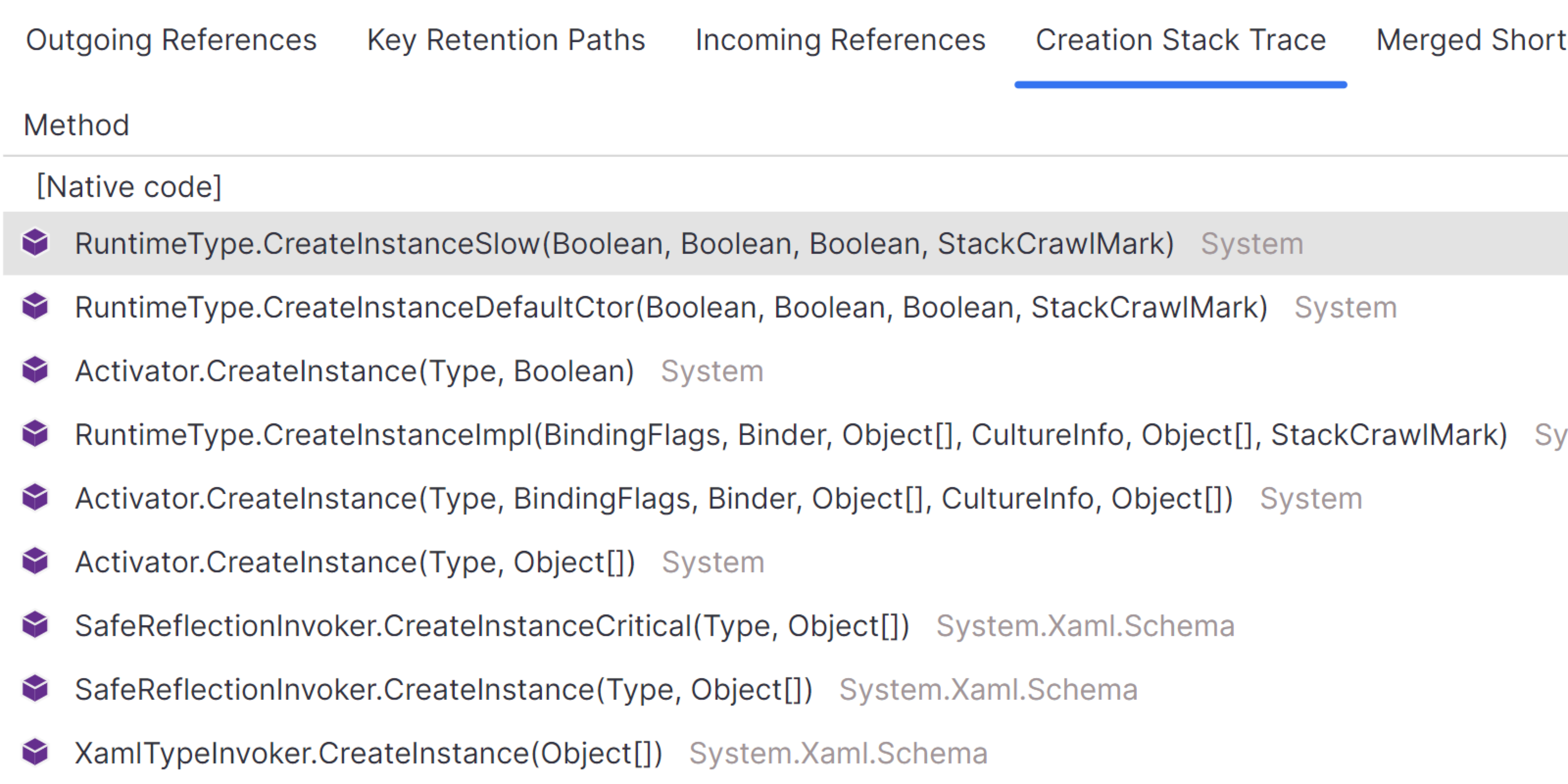 我们重新引入了 Creation Stack Trace(创建堆栈跟踪)视图,该视图此前在 UI 重新设计时被移除。 此视图显示导致对象创建的函数调用堆栈,帮助您更轻松地找出内存问题的根本原因。