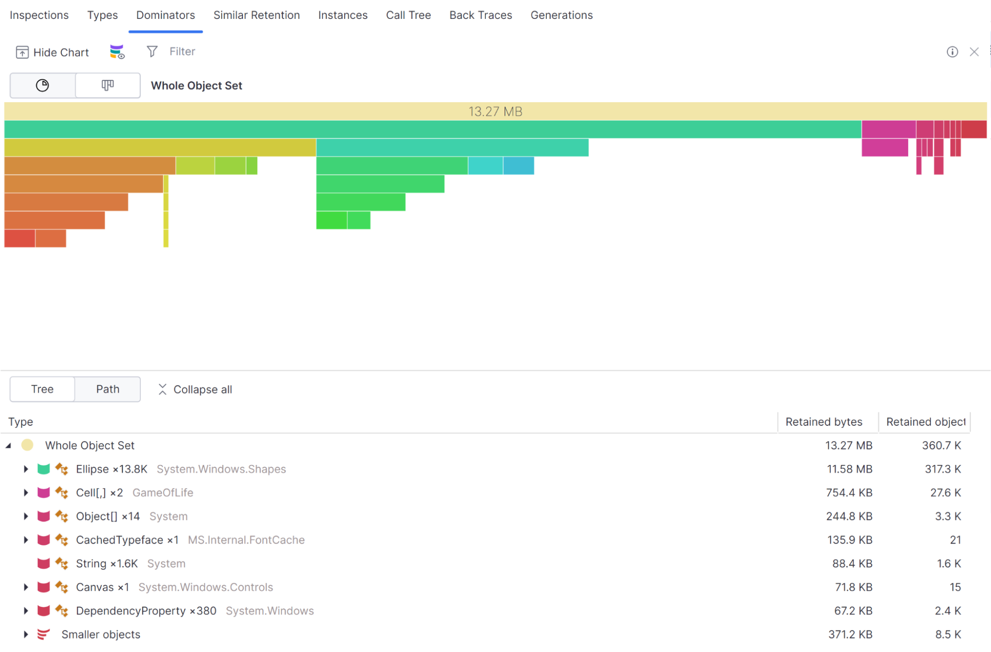支配项树现在能够显示为冰柱图,显示支配项和保留对象的内存消耗。 此功能适用于 Windows、Linux 和 macOS 上的独立版 dotMemory 和 JetBrains Rider 中的 dotMemory。