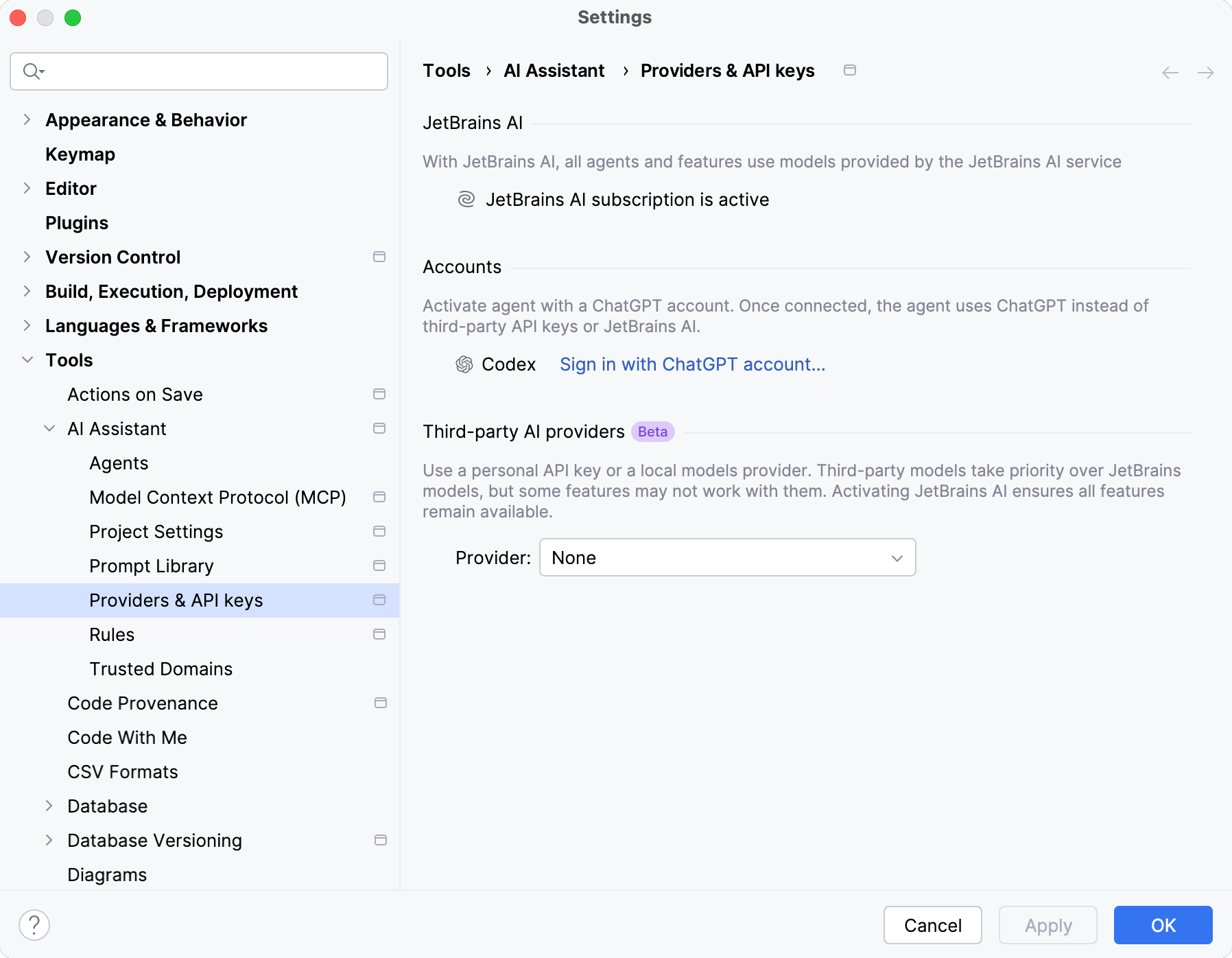 Codex is a third-party coding agent by OpenAI available for use in AI Assistant. It can help you to design and implement features, fix bugs, answer questions, review code, and assist with a wide range of development tasks.