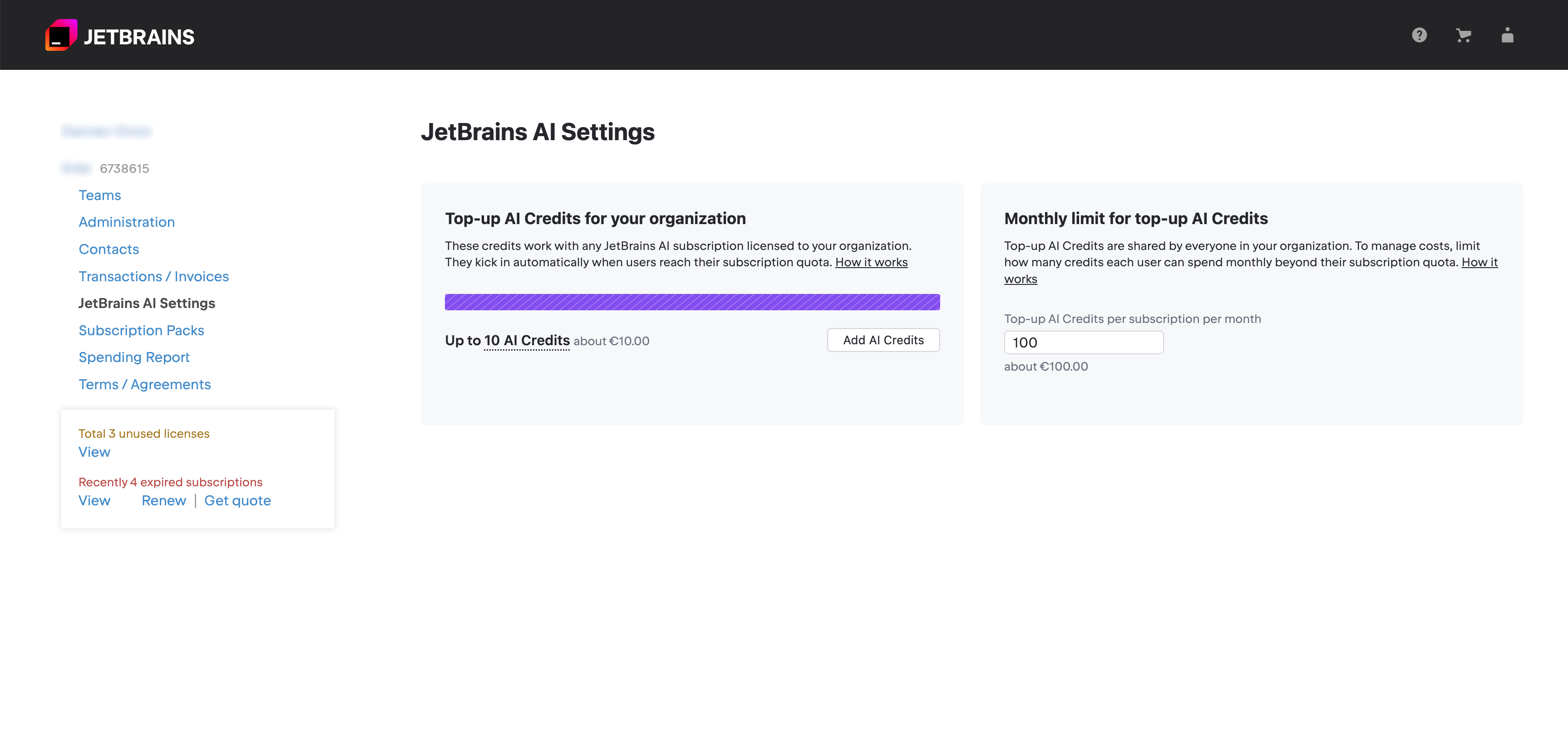 Top-up AI Credits are shared among all JetBrains AI licenses purchased by your organization. Administrators can set the limit on how much Top-up AI Credits can be used per subscription in the settings of your organization account.