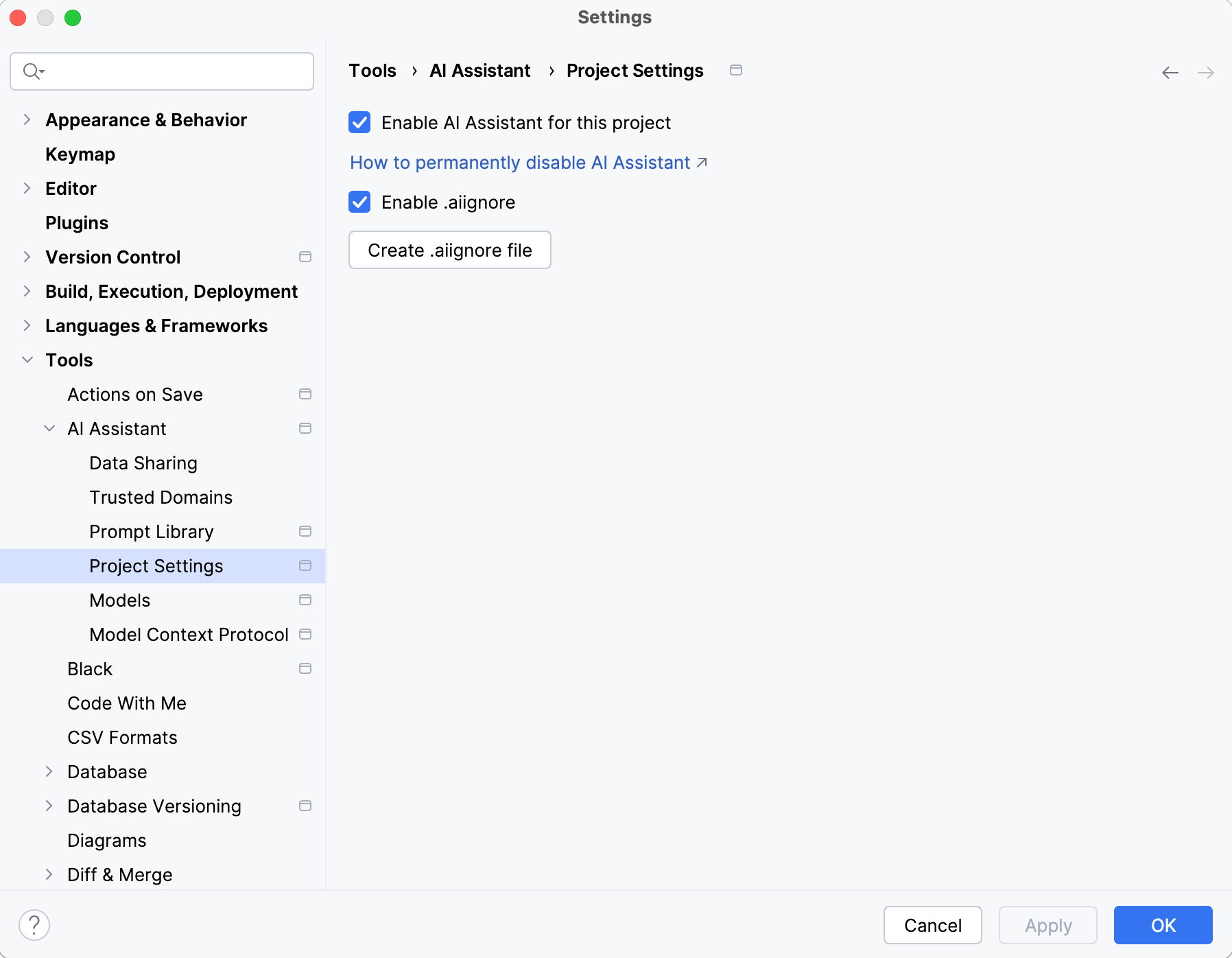 Enable .aiignore | Enable this setting to restrict AI Assistant's access to files and folders specified in the For more information about the |