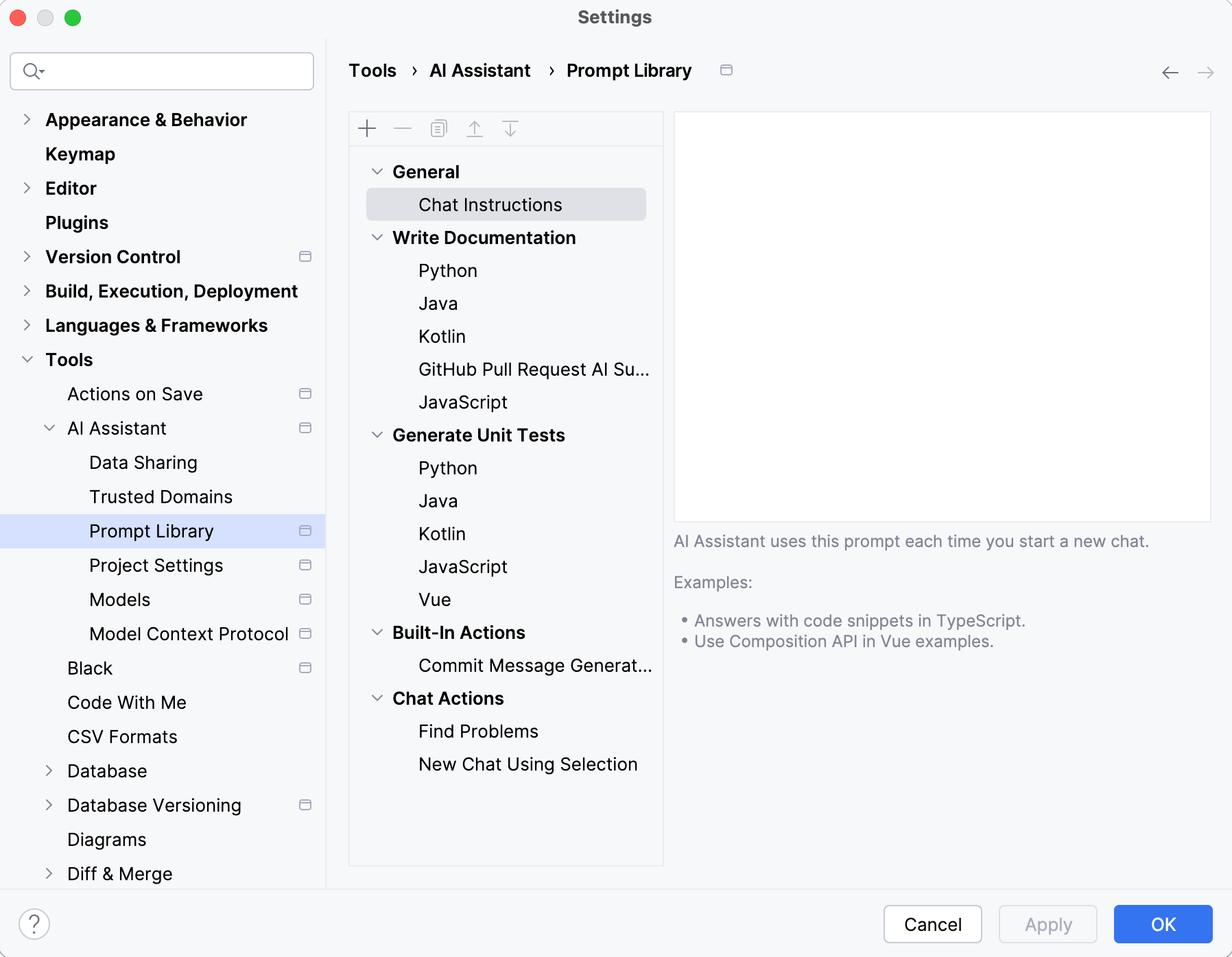 Wait for additional user input after invoking | When the custom prompt is invoked, AI Assistant chat opens, allowing you to provide additional context for the request. |