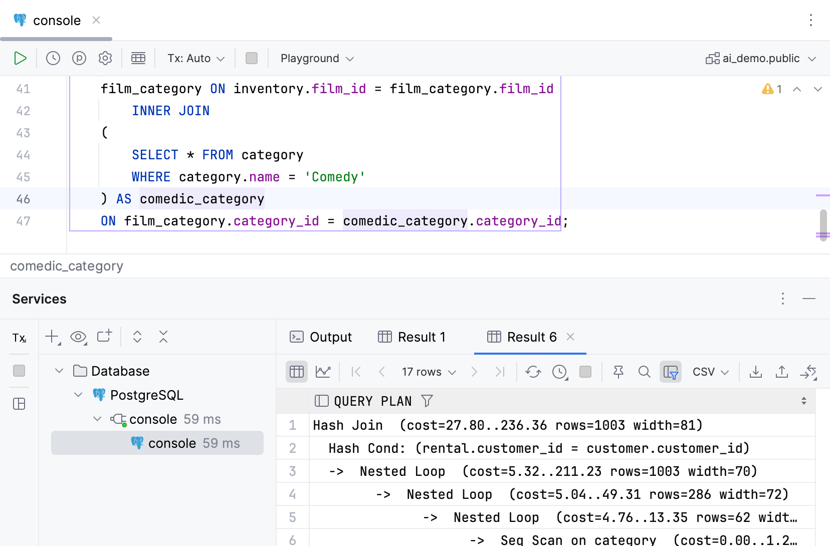 For illustration purposes, we will use the PostgreSQL Sakila schema imported to the ai_demo database. You can get the dump files by cloning the dumps repository.