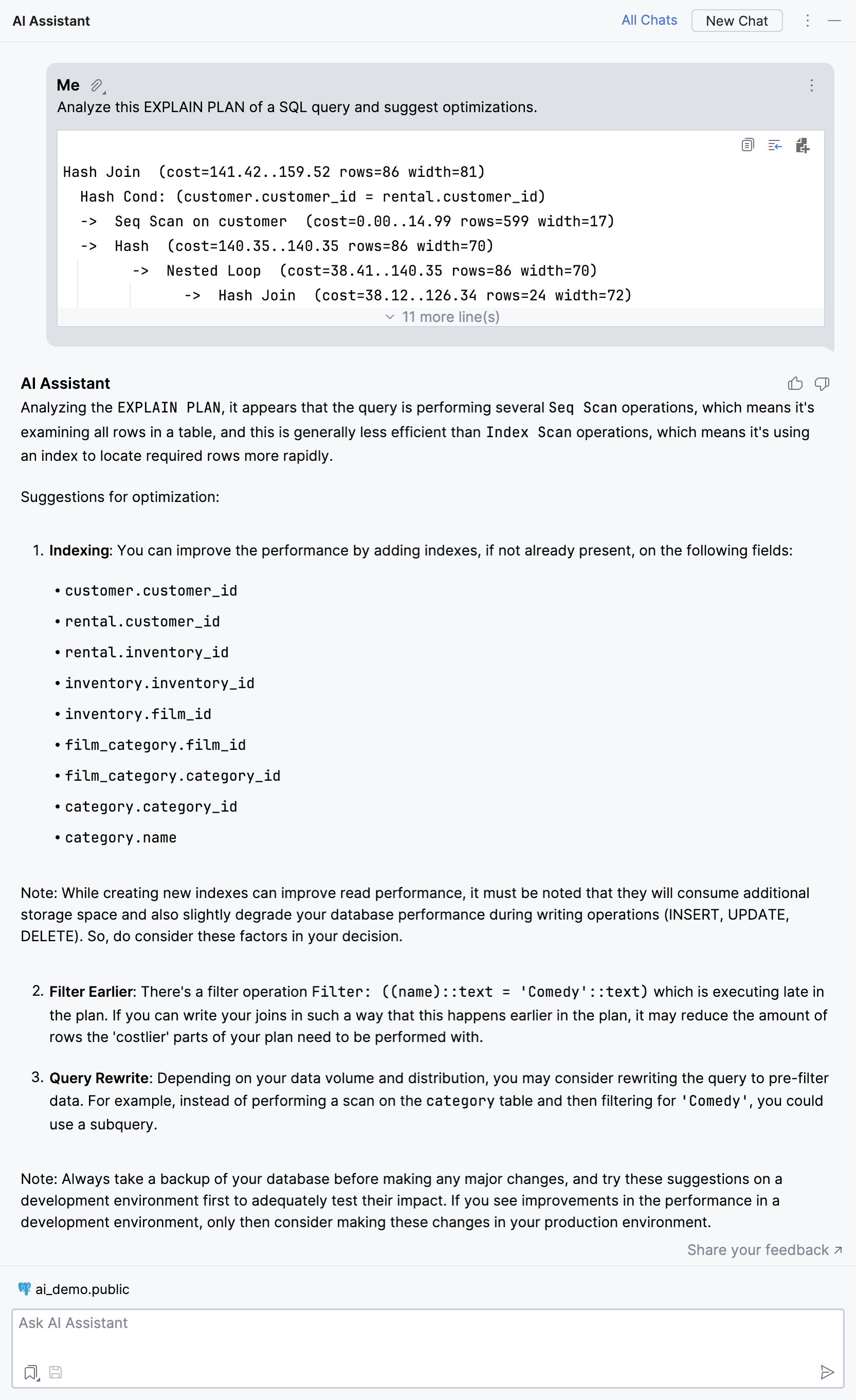 AI Assistant can help you with optimizing your schema and queries using the EXPLAIN PLAN command. Having access to your schema, it can analyze the plan and suggest optimizations.