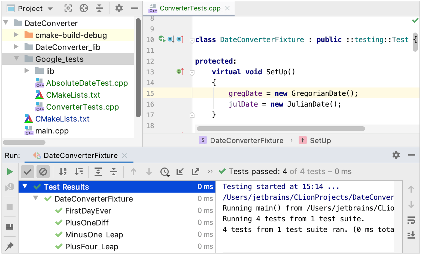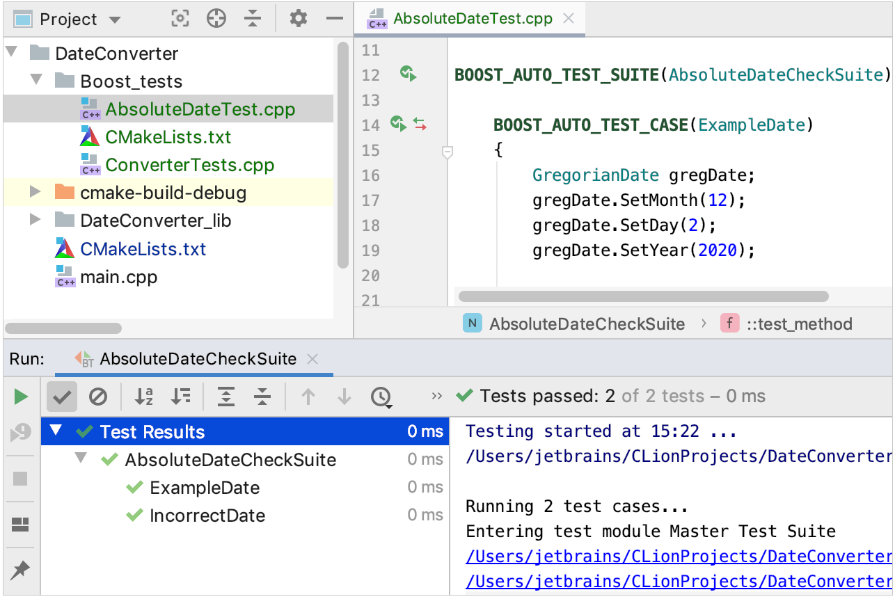 # adding the Google_Tests_run target add_executable(Google_Tests_run ConverterTests.cpp AbsoluteDateTest.cpp) # linking Google_Tests_run with DateConverter_lib which will be tested target_link_libraries(Google_Tests_run DateConverter_lib) target_link_libraries(Google_Tests_run gtest gtest_main)Copy the Google Test version of our checks from AbsoluteDateTest.cpp and ConverterTests.cpp to your AbsoluteDateTest.cpp and ConverterTests.cpp files.
