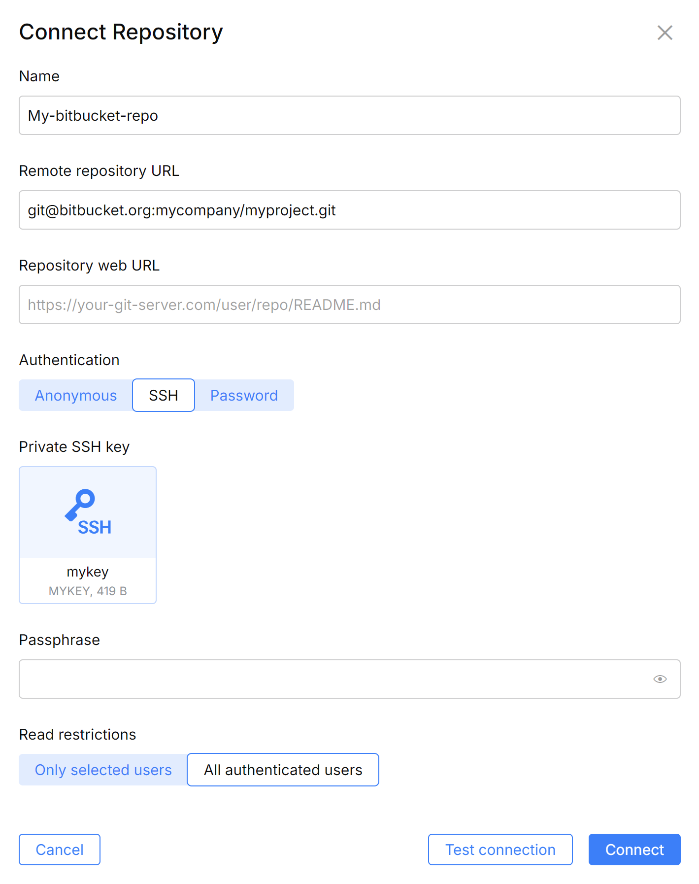 • Remote repository URL – the SSH or HTTPS URL of the repository, e.g., git@bitbucket.org:MyCompany/my-project.git or https://bitbucket.org/MyCompany/my-project.git