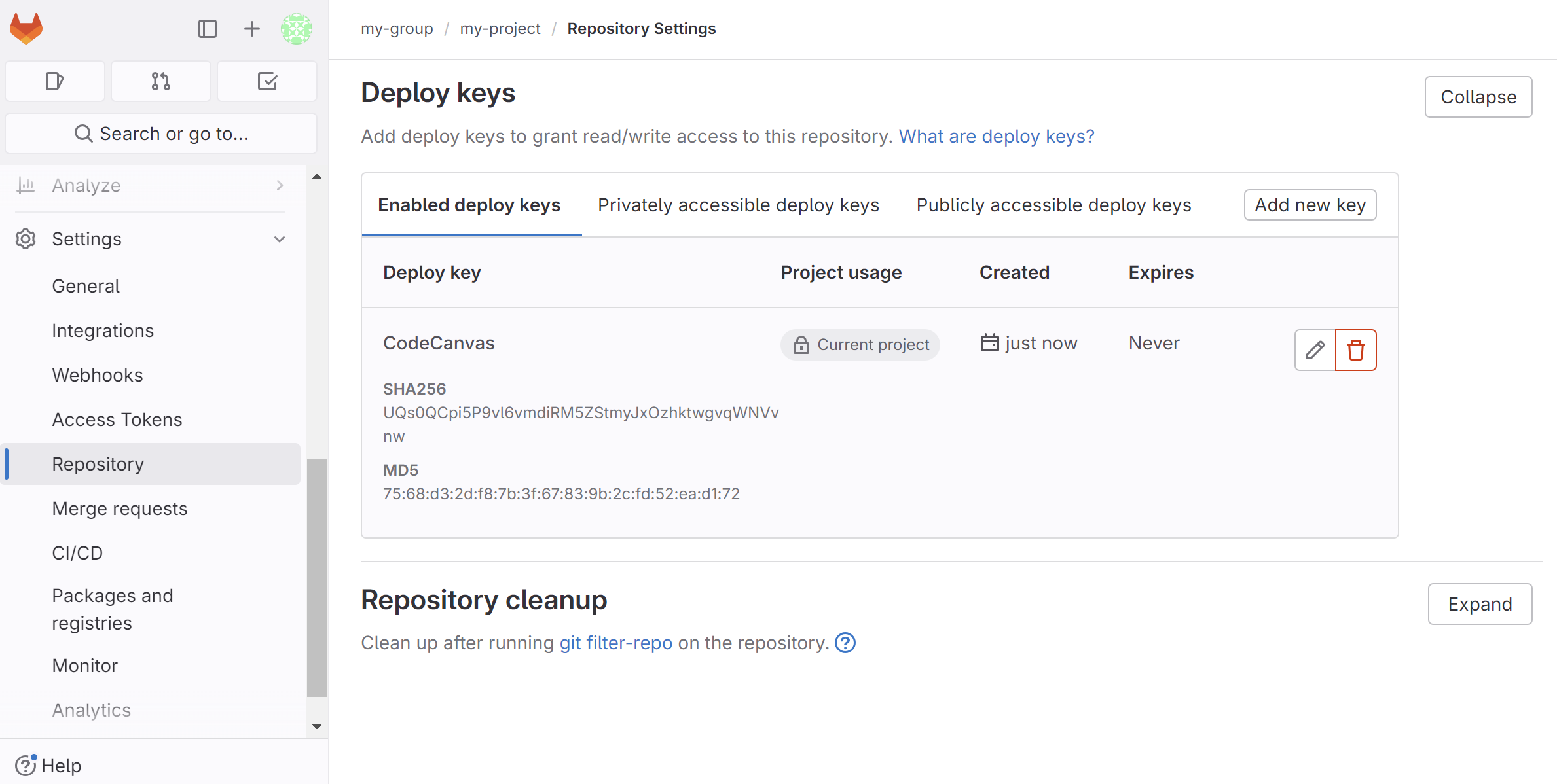 mykey(private key) andmykey.pub(public key).On your GitLab server, go to the project | Settings | Repository | Deploy keys and click Add deploy key. Paste the contents of the public key file (