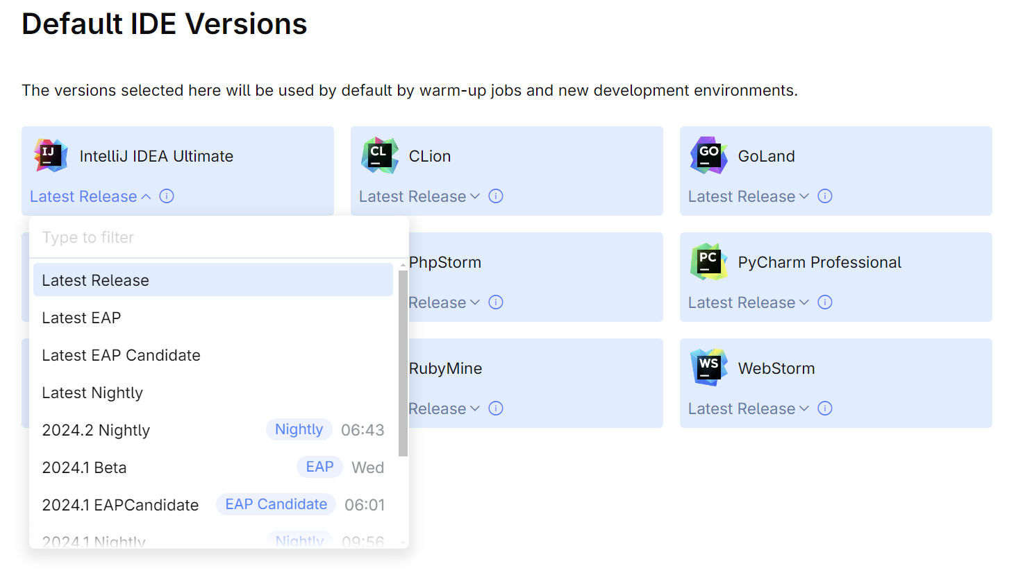 You can predefine the IDE versions that will be used in dev environments by default, i.e., in the case when the IDE version is not explicitly specified in a dev environment template. If you don't predefine the default IDE versions, the default is the latest IDE version available in IDE feeds.