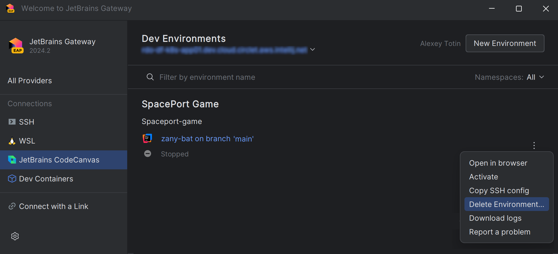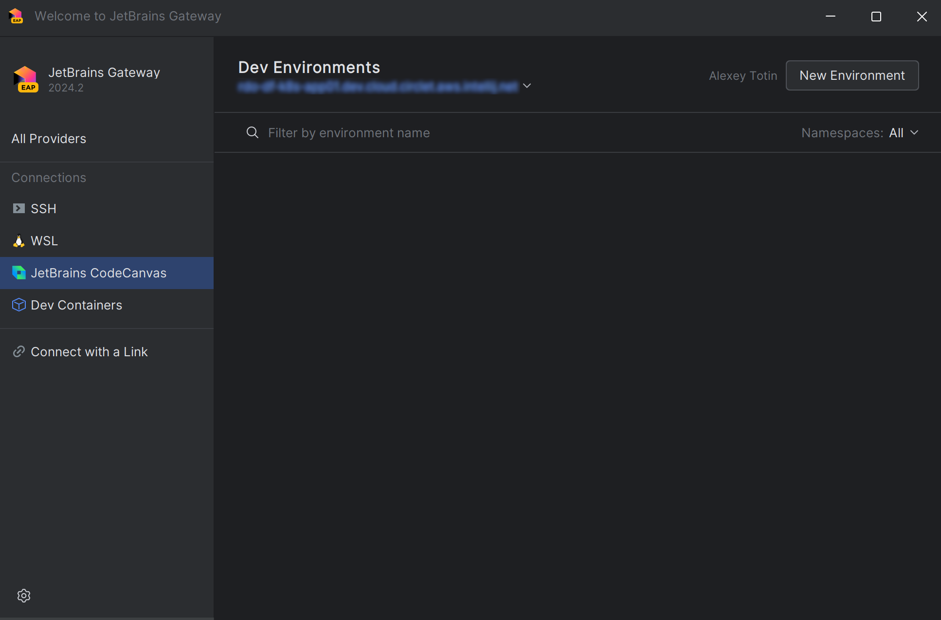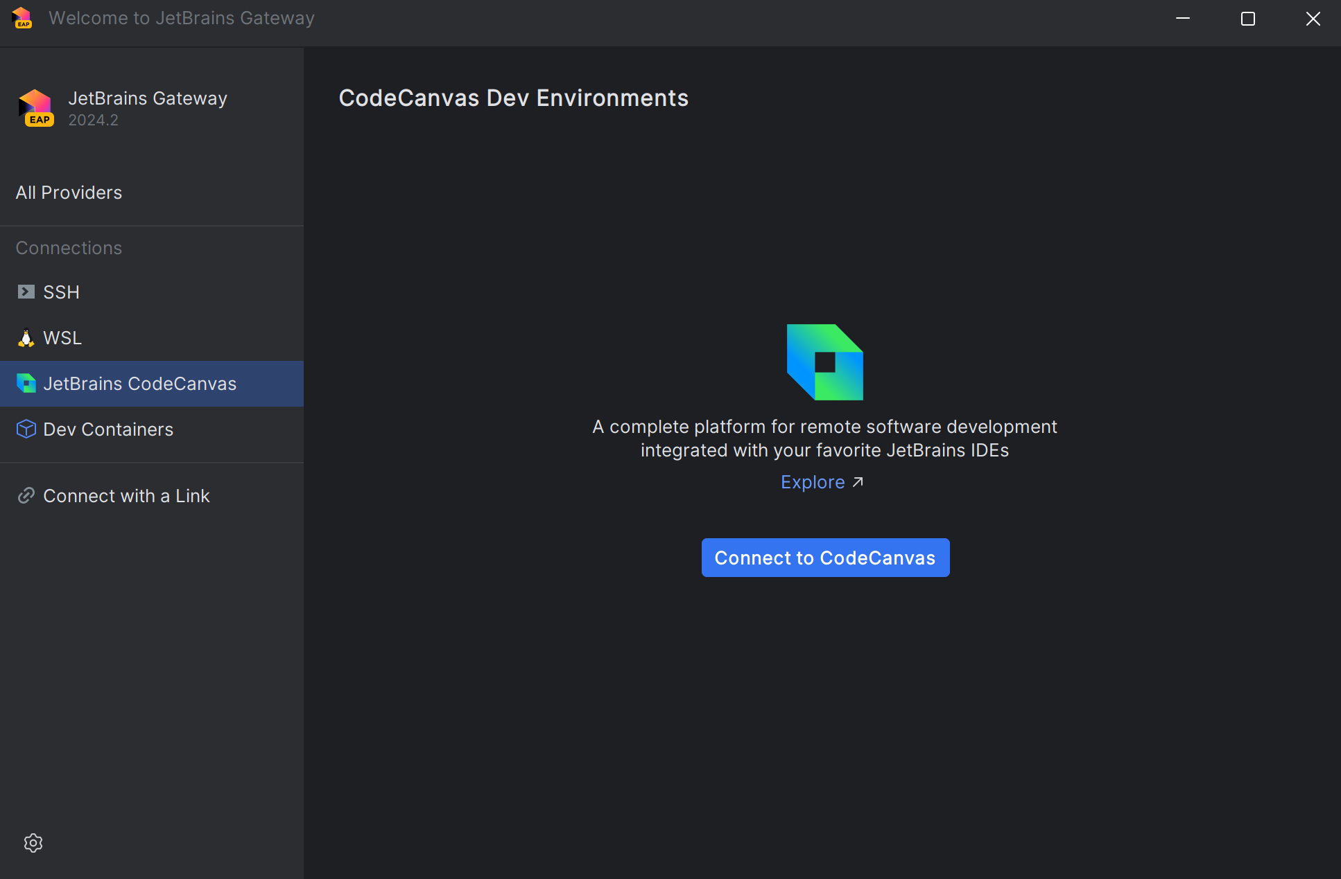 1. In the Gateway app, select JetBrains CodeCanvas from the list of available Connections.