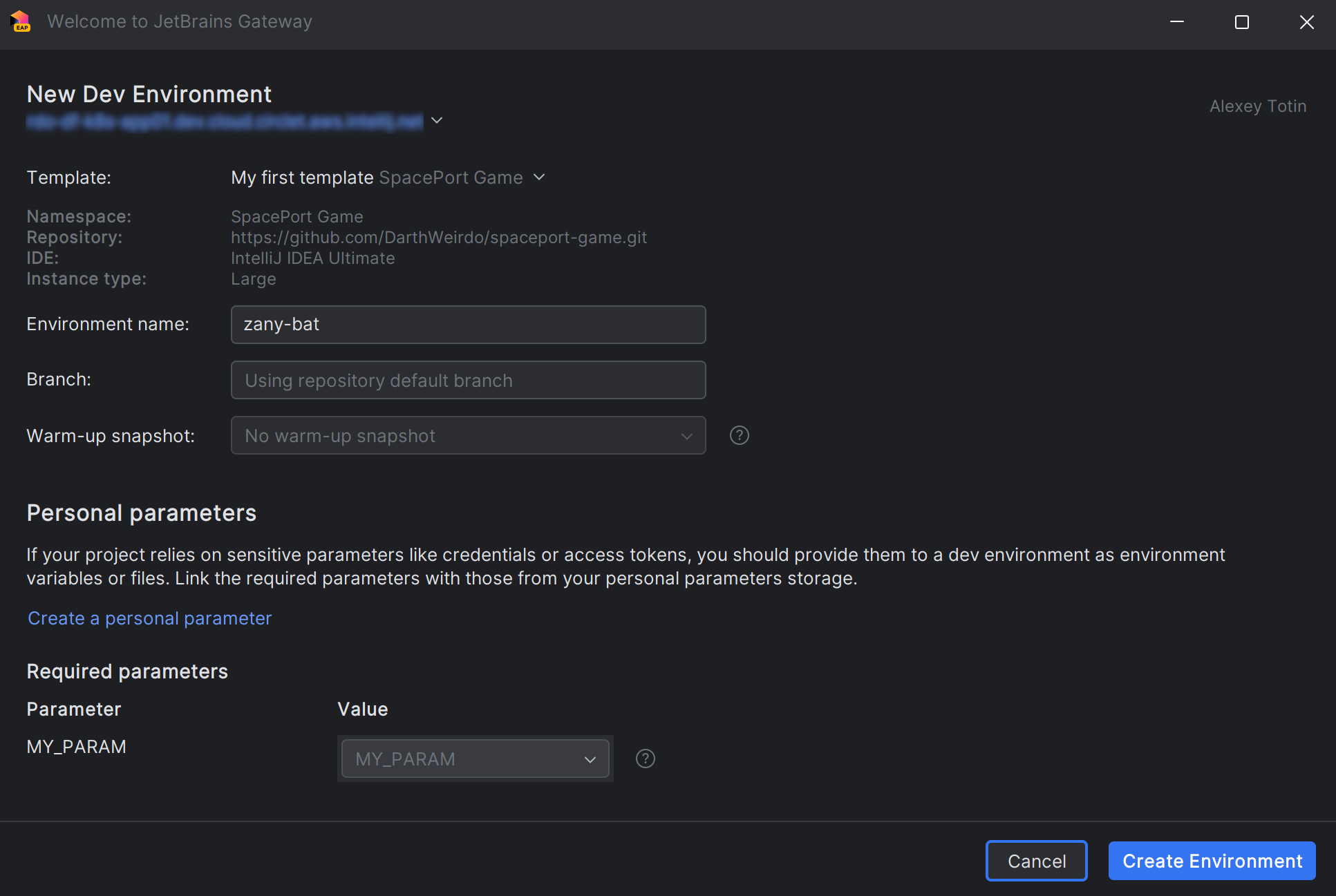 • Template – a dev environment configuration created by the project administrator for your project. It includes the dev environment resources, image, Git repository, and other settings.