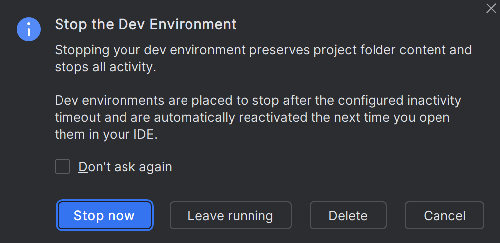 You can close your remote IDE at any time. Gateway will ask whether you want to stop or keep the dev environment running. Even if you stop the dev environment, your uncommitted changes will be saved on a dev environment volume. The environments left running will be automatically stopped by timeout (set by the system administrator).