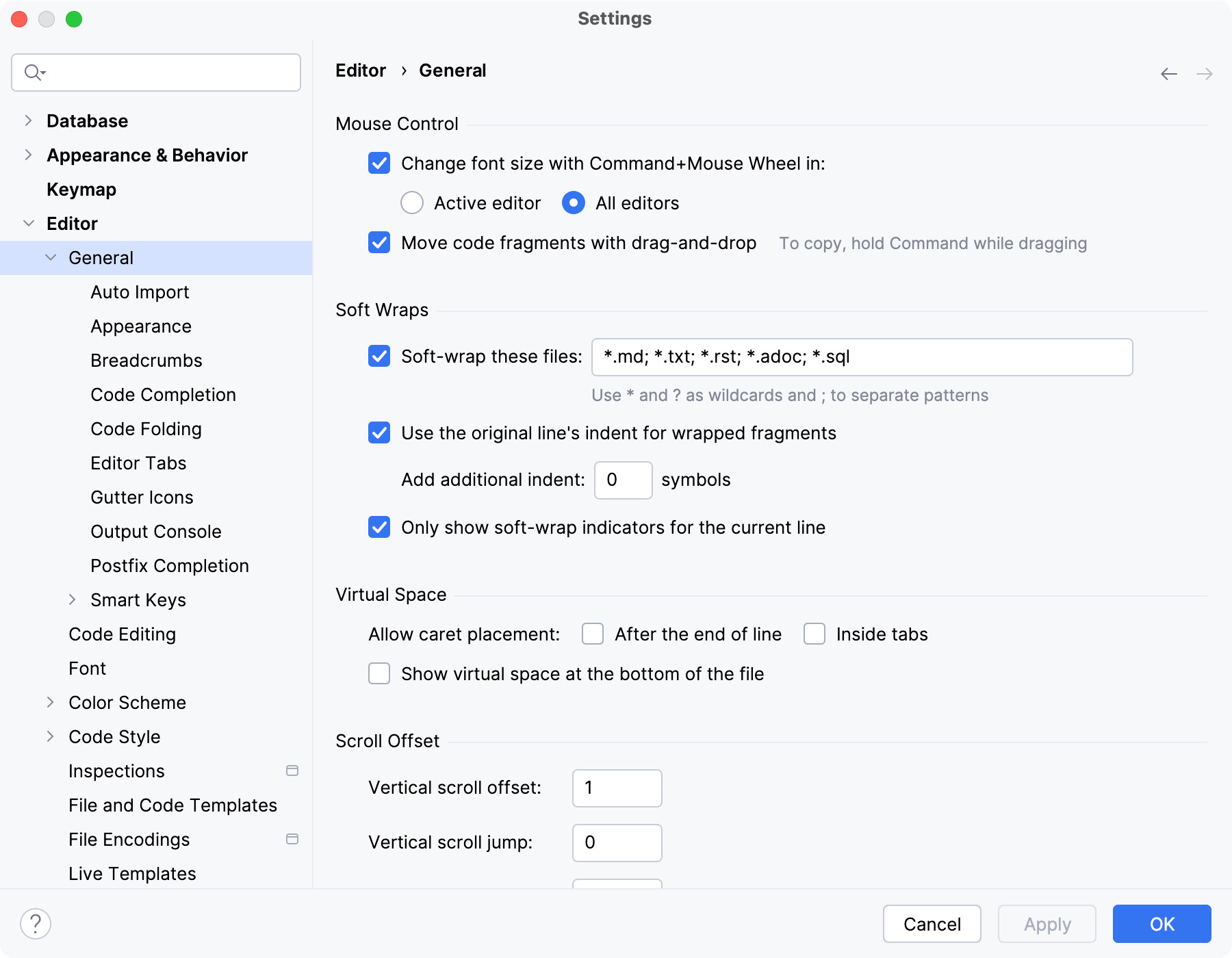 If this checkbox is selected, the currently edited line (even if it is the final line) can be scrolled to the top of the screen. DataGrip adds the necessary number of virtual lines.