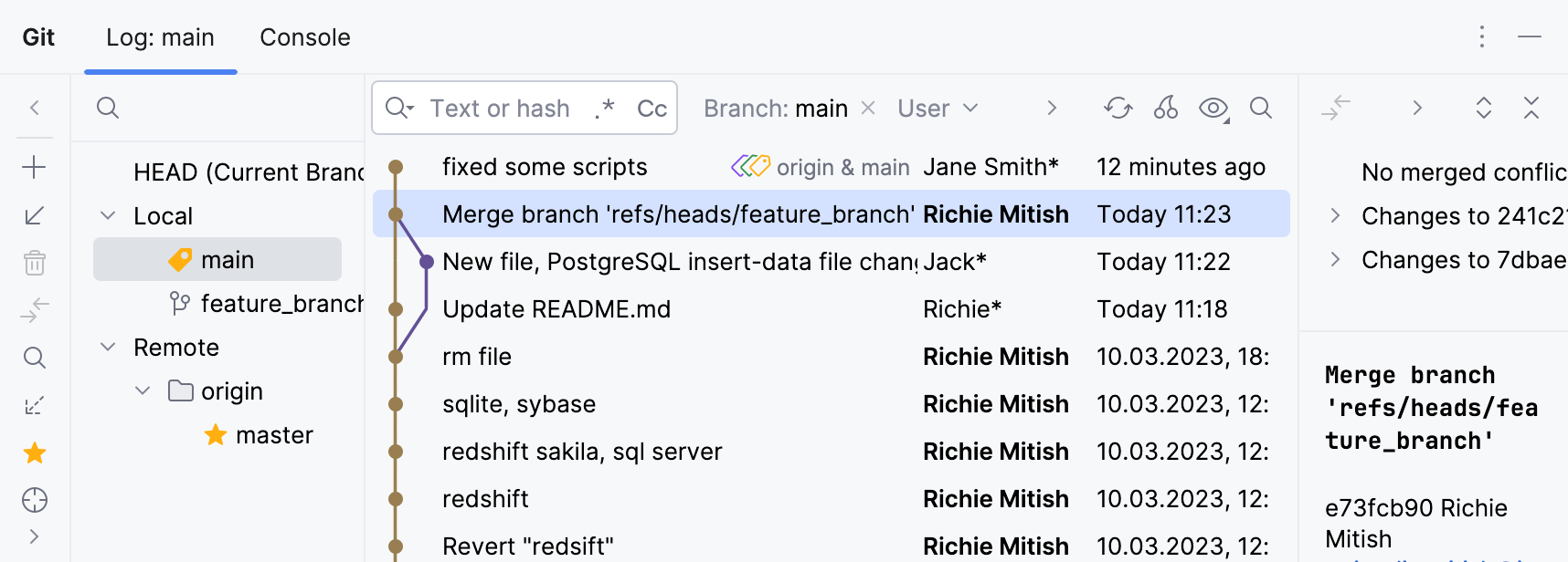 If your working tree is clean (which means you have no uncommitted changes), and no conflicts occur between your feature branch and the target branch, Git will merge the two branches, and the merge commit will appear in the Log tab of the Git tool window Alt+9: