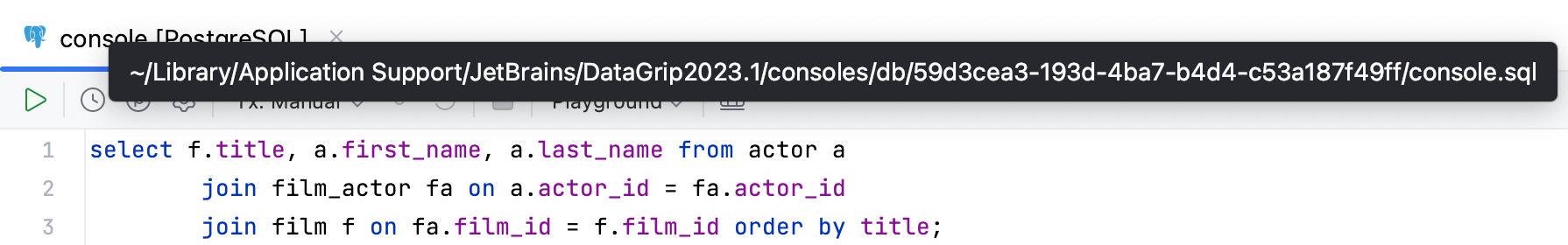 For full information about how to work with query files, query consoles, user files, and scratches, refer to the File management section.