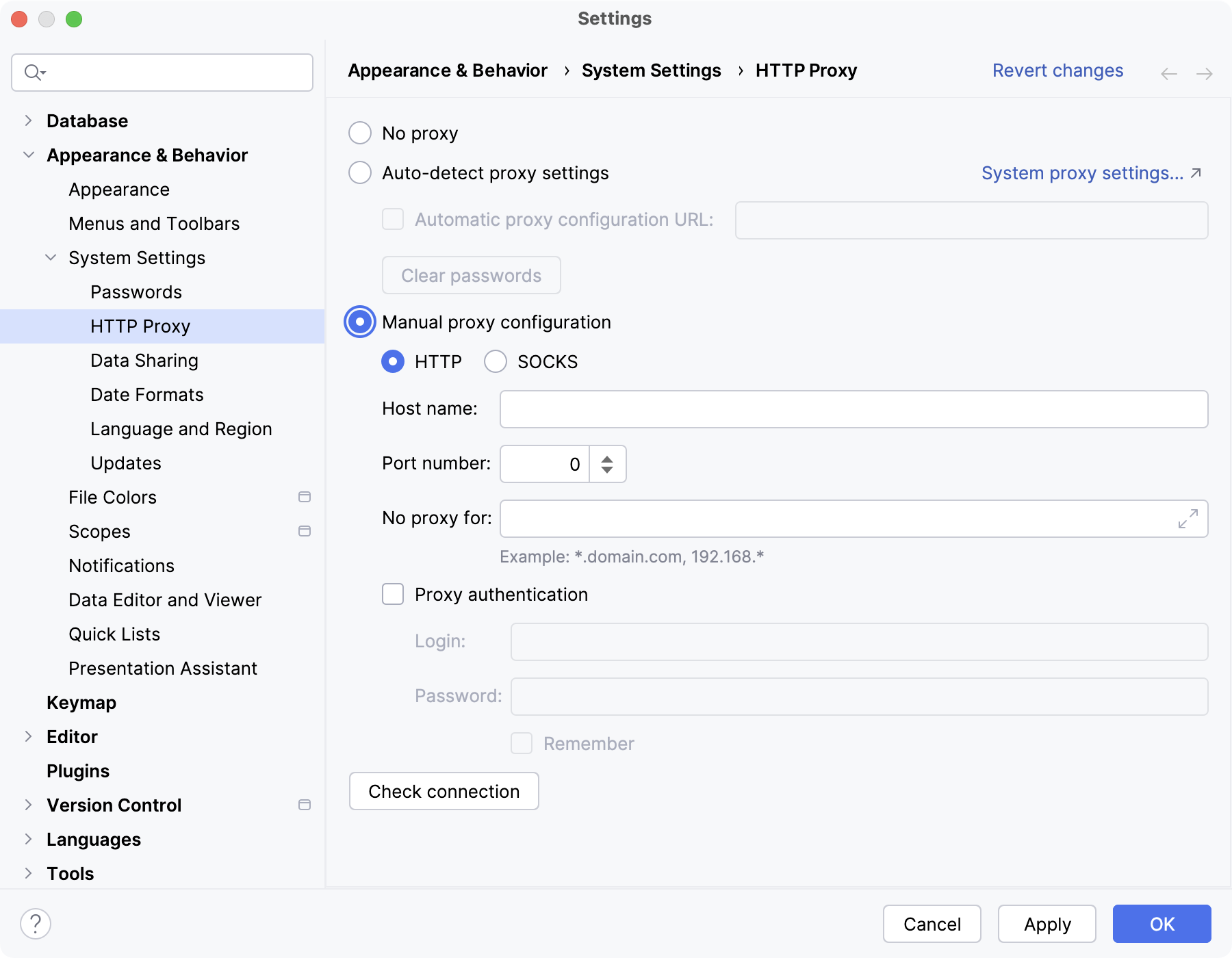 By default, DataGrip uses your system proxy settings. Use this page to customize settings of an HTTP or SOCKS proxy server for DataGrip.
