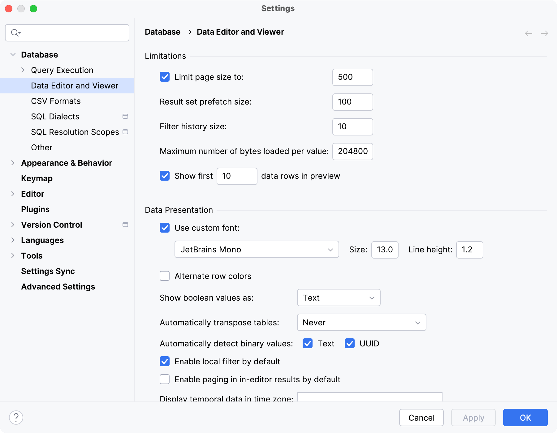 Result set prefetch size | Number of rows from a database that is retrieved in one chunk. A bigger number means less round trips between IDE and a database but more memory for storing a chunk. |