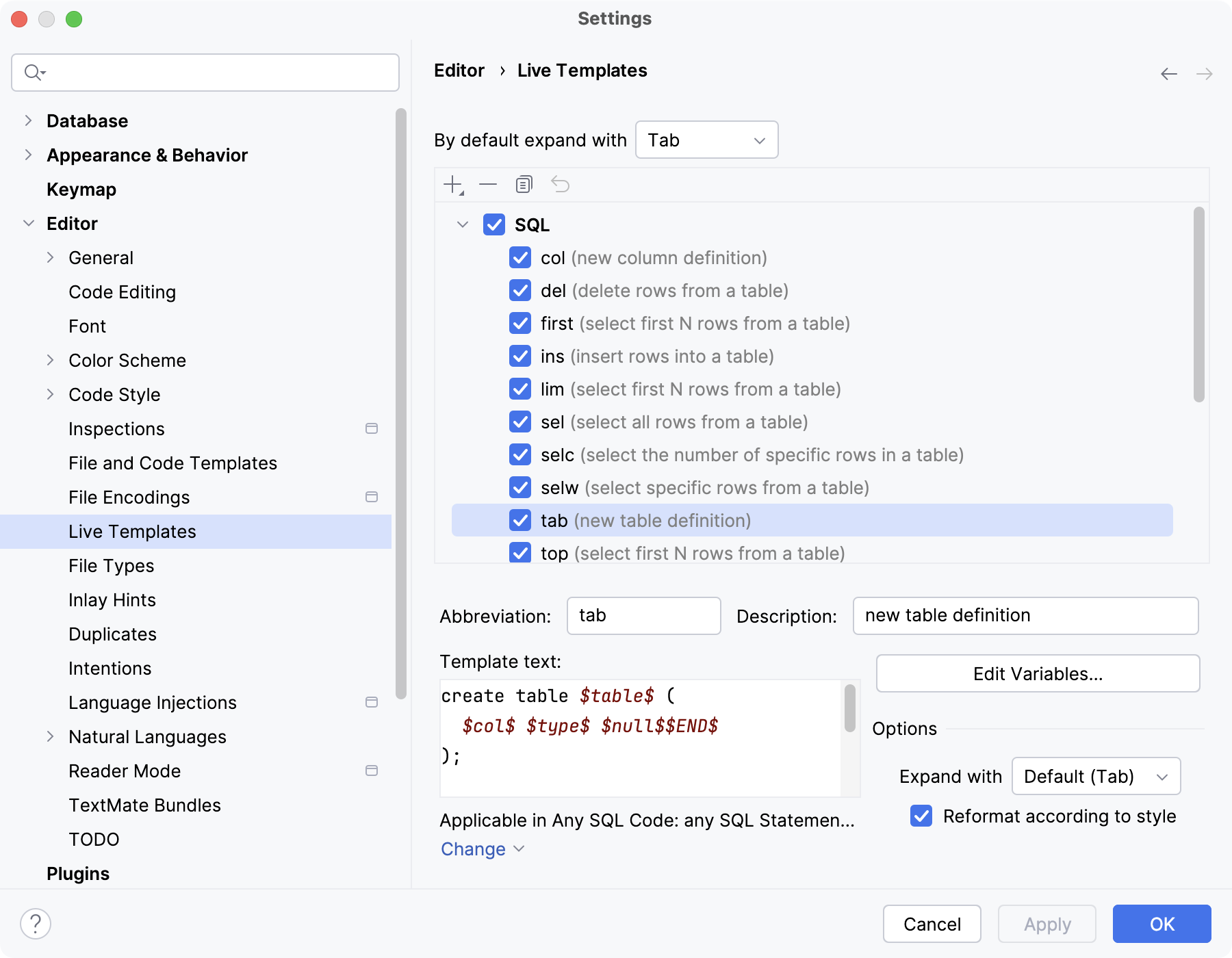 Use live templates to insert common constructs into your code, such as statements or definitions of database objects. For example, there are live templates for the SELECT, CREATE TABLE, UPDATE TABLE and other SQL statements.