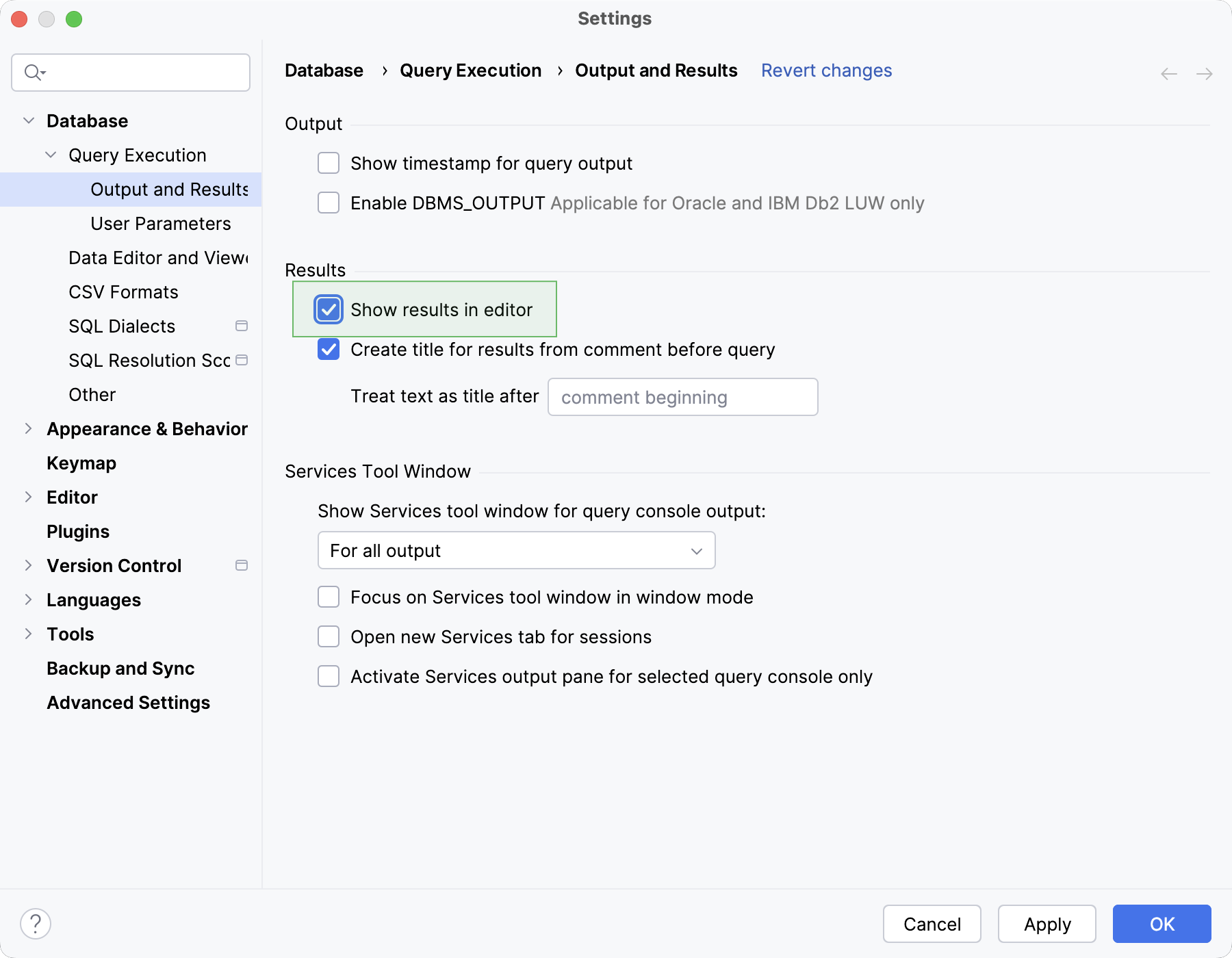 To disable this feature, open settings Ctrl+Alt+S, navigate to , and clear the Create title for results from comment before query checkbox.