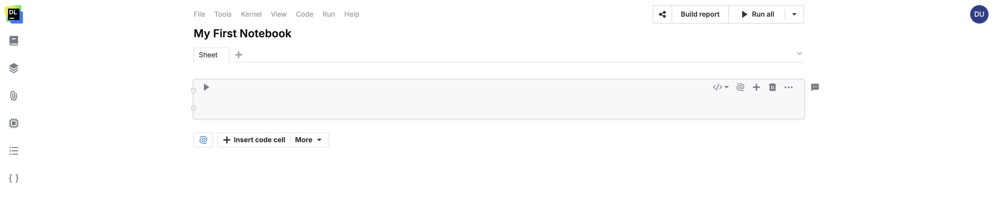You created a Python language notebook, which is automatically opened in the editor. For now, the notebook contains only one code cell, which is empty.