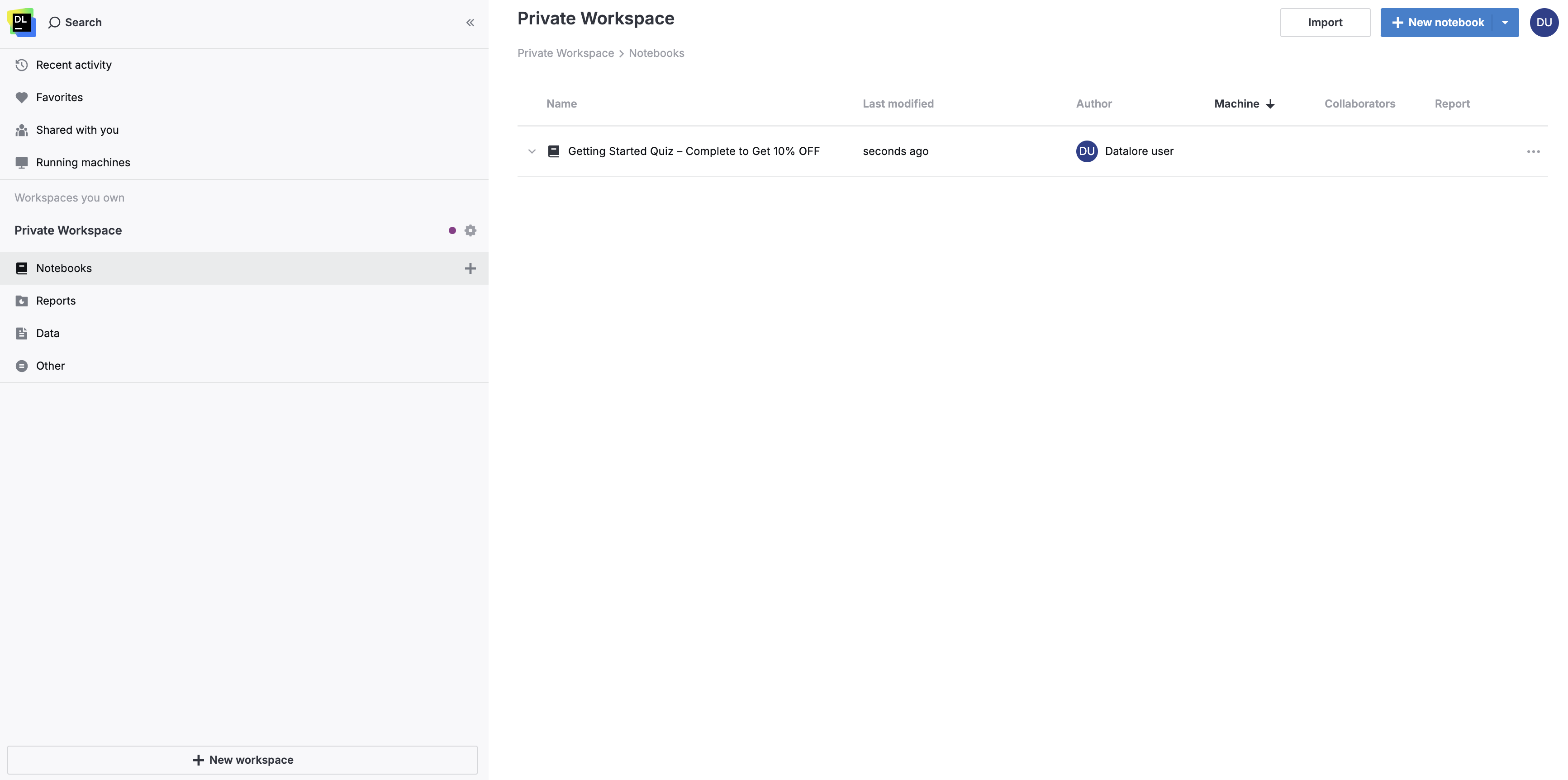 You begin by creating your first own workspace. Own workspaces can be shared with other Datalore users, which is their main advantage over the 'unsharable' Private workspace.